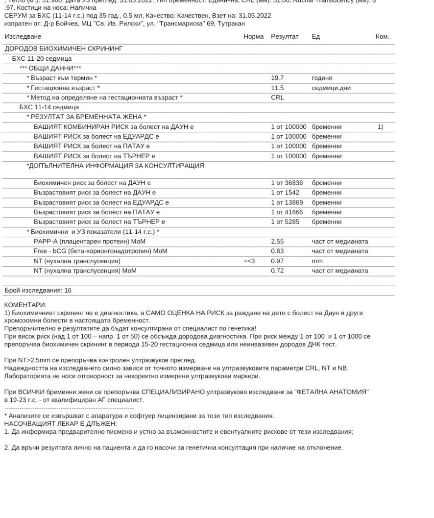 Здравейте имах много нужда от такава тема понеже Гинеколога ми все още не ми писа как са изследванията , които пратих (той ми каза да ги пратя). Надявам се тук да има някой , който да ми помогне! Бременна съм в 12+4 , но бебечо е седмица напред. Имам един спонтанен аборт ( първа бременност) в 9г.с се извърши кюртаж , но ембриона спрял да се развива в 6+6. За сега всичко е наред имах отлепване в края на 9 седмица лежах в отделението и всичко се оправи минахме раната фетална морфология и скрининг за Даун. Прикачвам изследванията си следващия ми преглед е на 21 юни.
