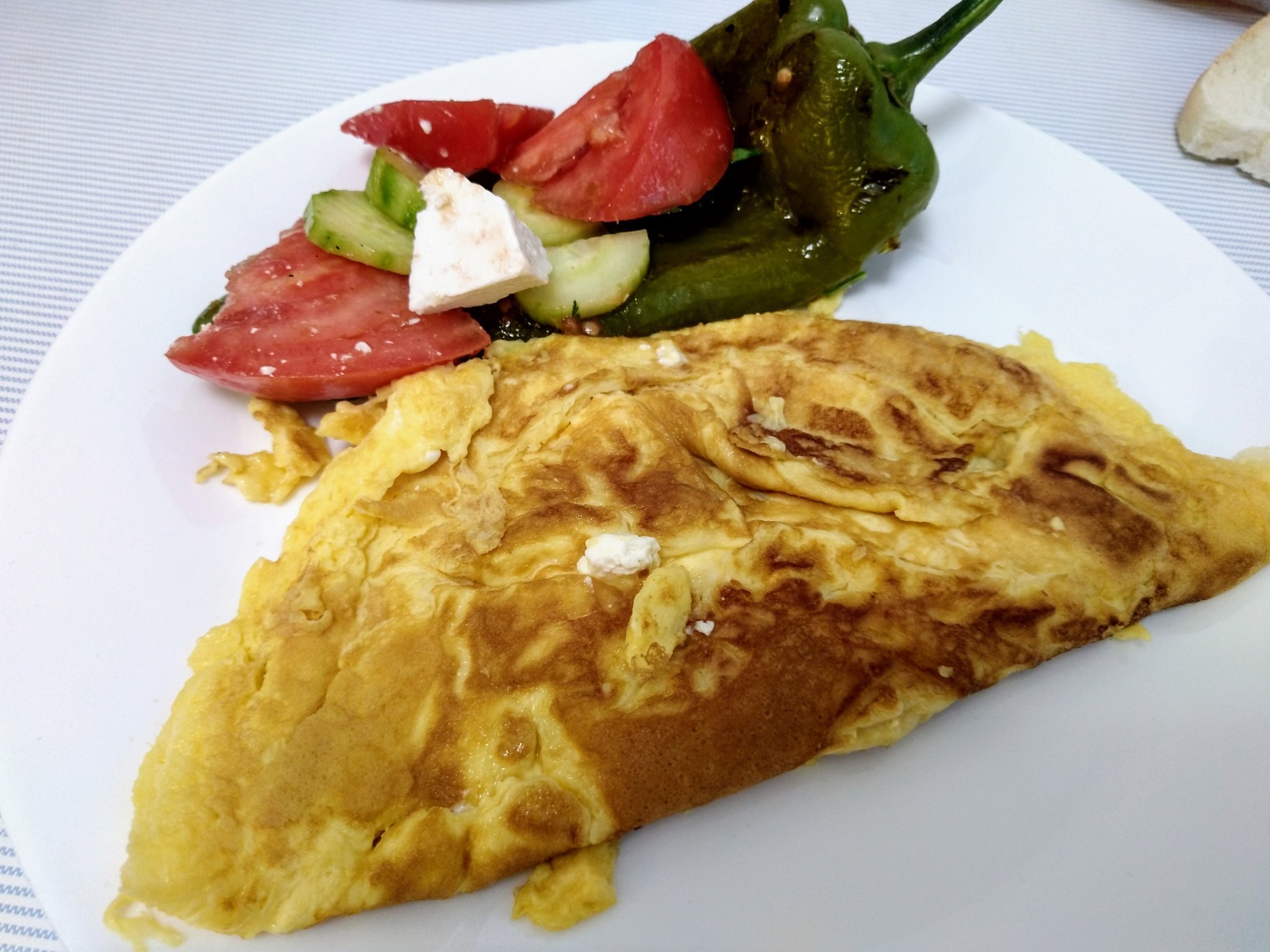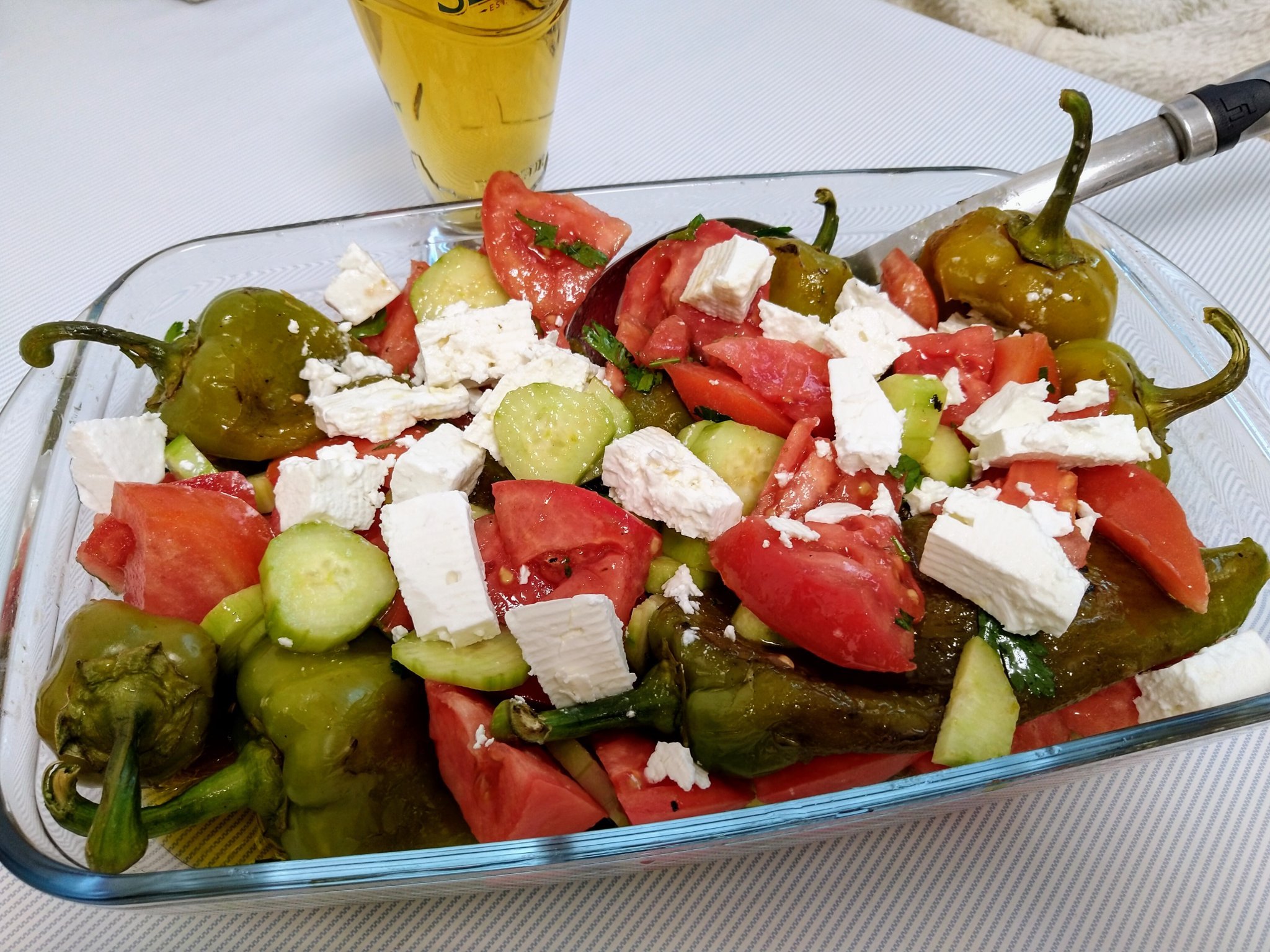 Зелена салата, домати, маслини, сварено яйце, пармезан, поръска от пържен лук, сол, лимон, зехтин.