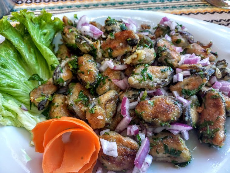 Панирани миди в чесново масло с подправки, а аз си поисках и червен лук, сложих му сол, оцет  и олио и си го наръсих отгоре.Голяма вкусотия. За пръв път ядох миди, това ми беше втората порция.