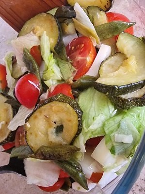 Набързо спретнах само един кокосов кекс от готова смеска, много пухкав стана с 4 яйца Smiley не се стърпях да го нарежа топъл и се посмачка. Днес ще сме на салатки, за да не са съвсем постни добавих пържени домашни тиквички и пържен домашен зелен боб Hug