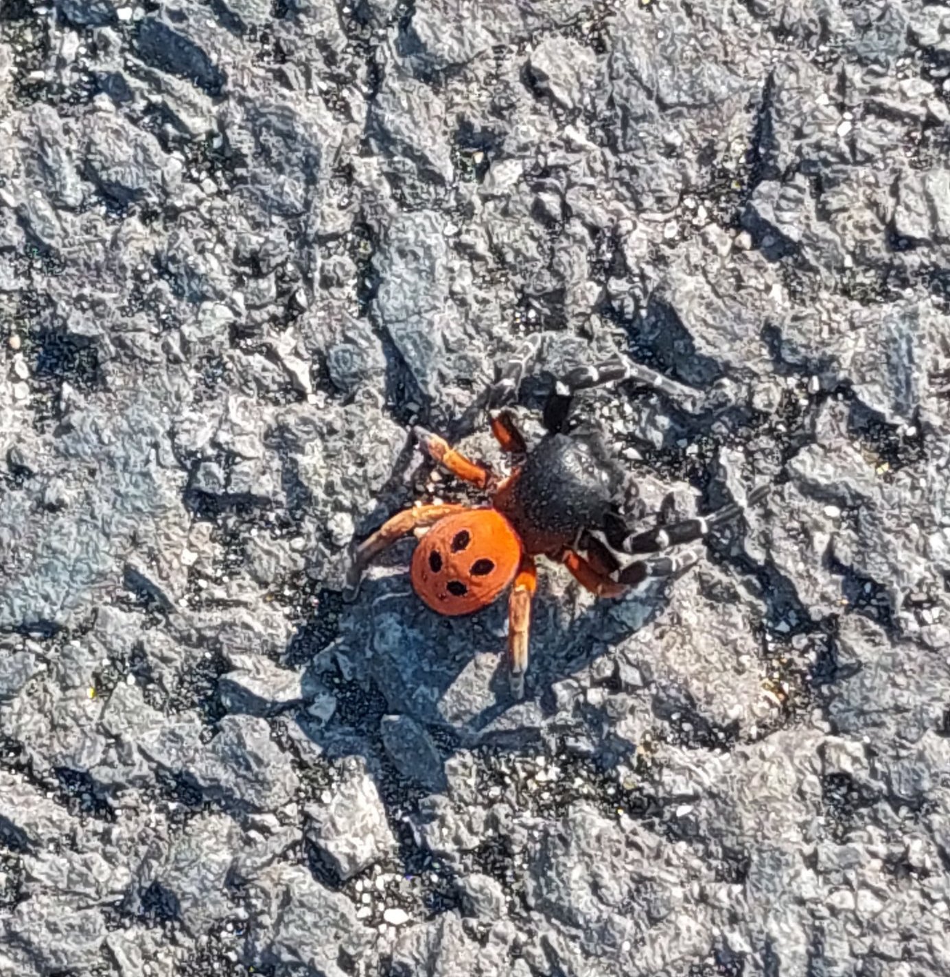 Аз за паяка се интересувам, точно такава гад не бях виждала. А имаме едни дето си носят бебетата на гърба - тях не ги доближавам аз, само надникнах веднъж над един. ММ ходи да се разправя с тях, беше направил май клип или снимки, ама не мисля да ги показвам. Този и той изглежда доста неприятен с предупредителните цветове...