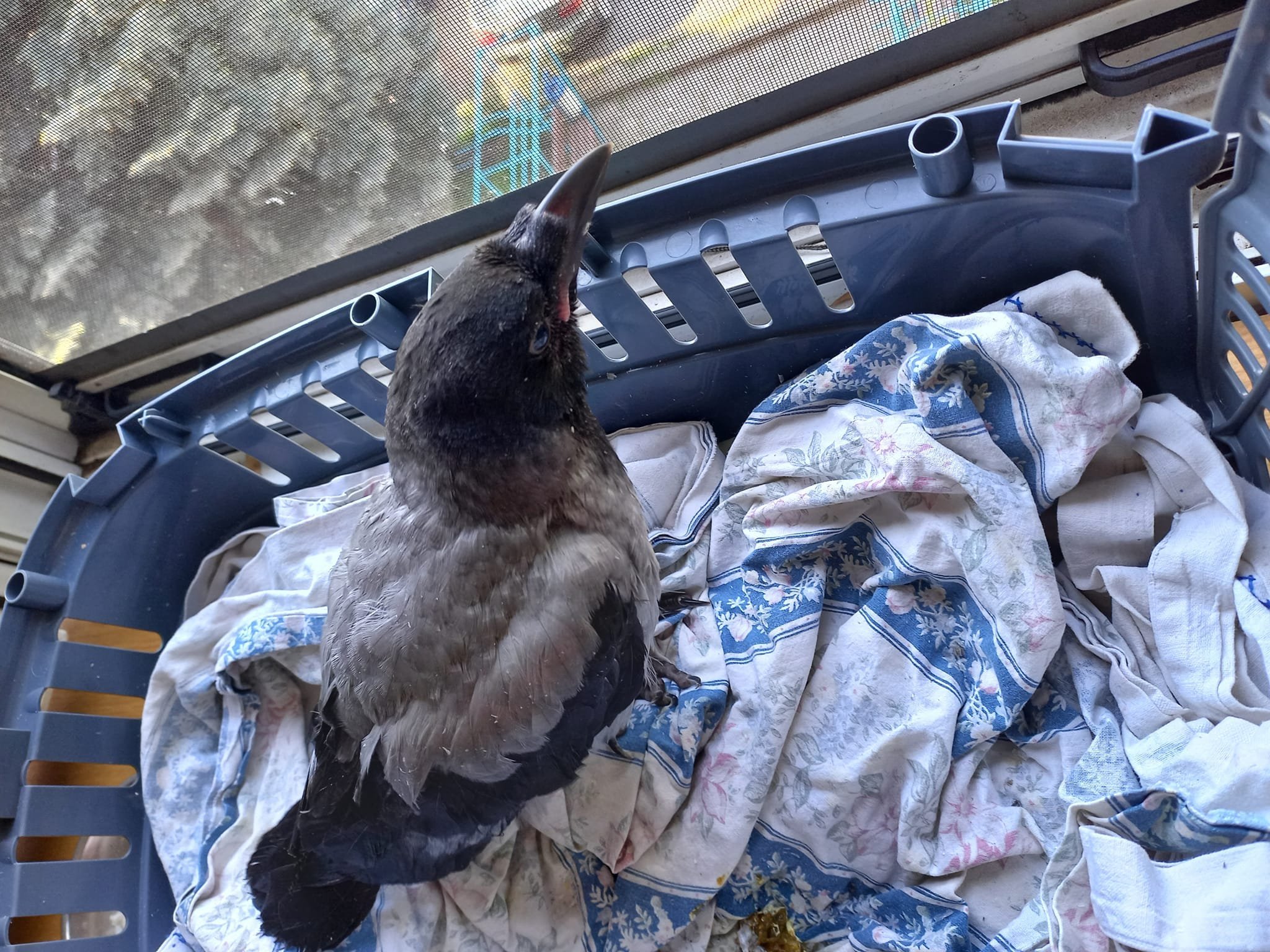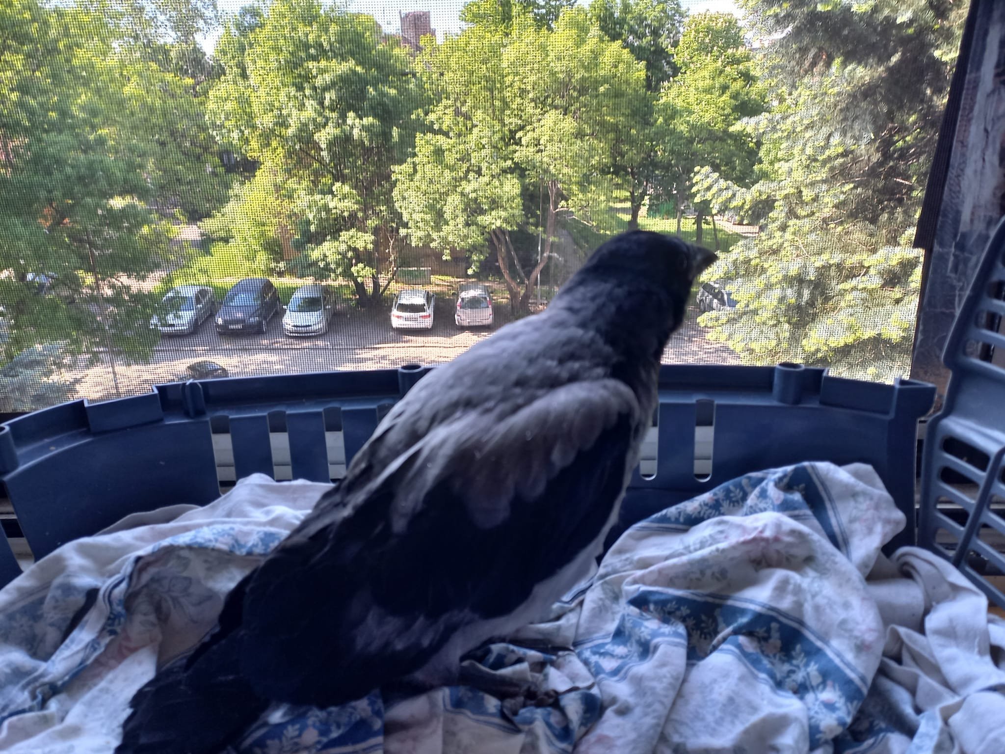 Нашето свраче.От дивите животни отказаха да го вземат, щото е с дефектно краче и нямало да оживее, казаха да го оставим на съдбата. На едното краче са му изкривени назад пръстите и не може да се държи на клон, а още не може да лети.Котките се гласяха да го изядат. През деня го държим на прозореца, да си общува с майка си.