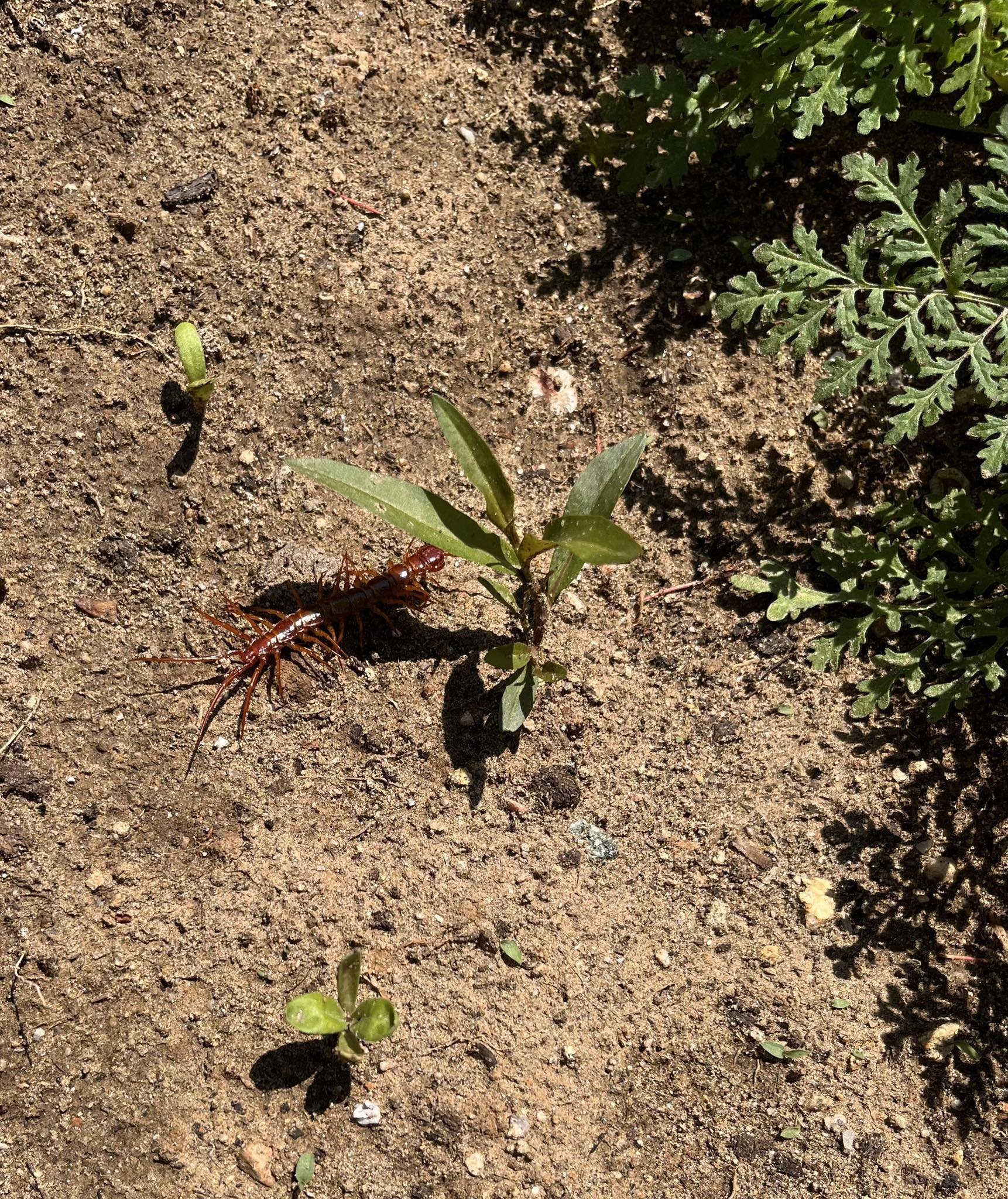 За пръв път виждам такова животно (дано е за последен). Стоножка ли е, щипалка ли е - не знам, ама се движеше адски бързо и търсеше сянка. Накрая се скри в едни новопокарали цветя и те си останаха неоплевени...