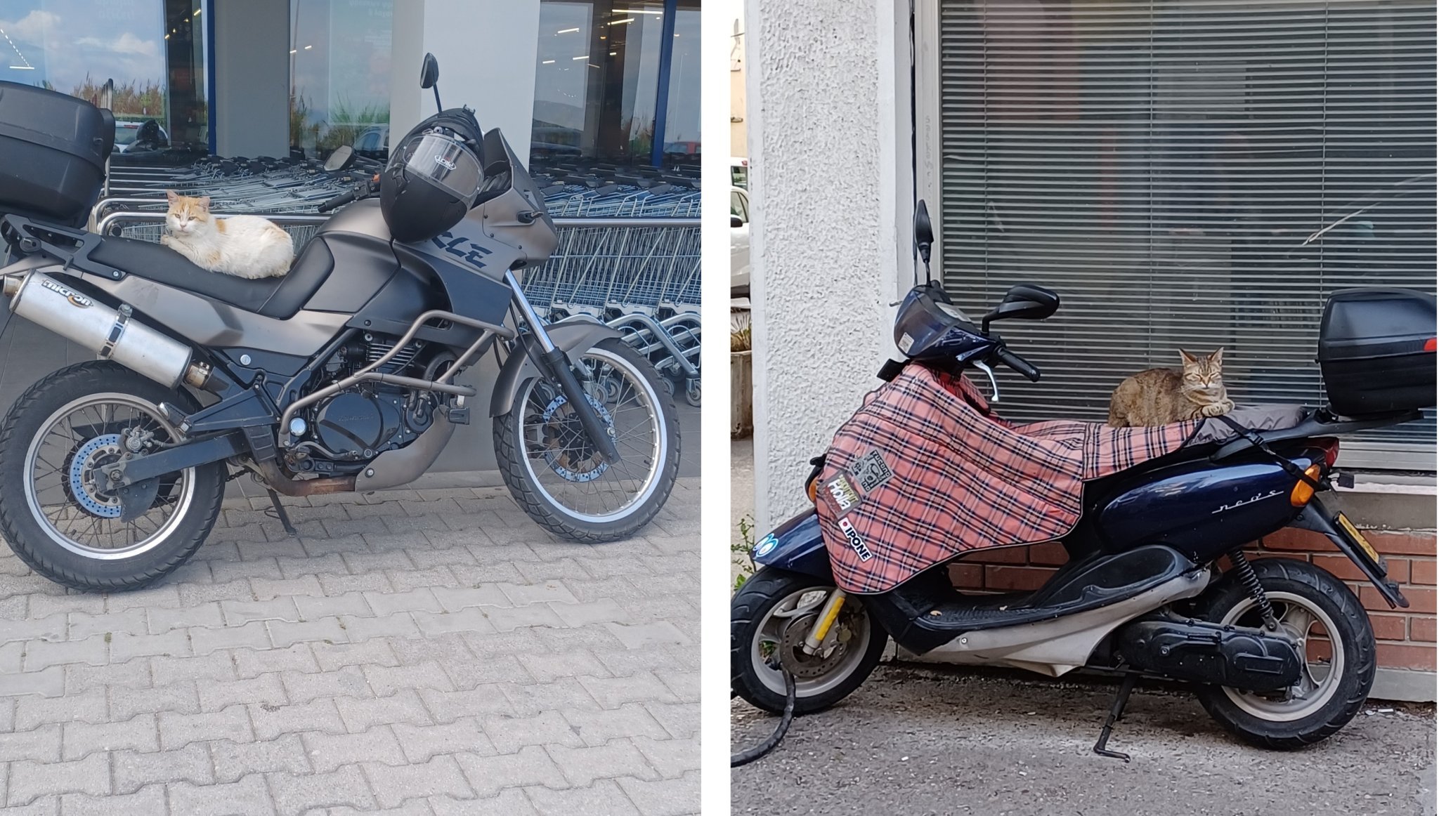Влизам в серия котки - любители на мотори. Едната съм я пускала вече, а другата е от днес. Снимани в две балкански страни - съседки. Явно им харесва формата на седалката, а може би им е топличко.