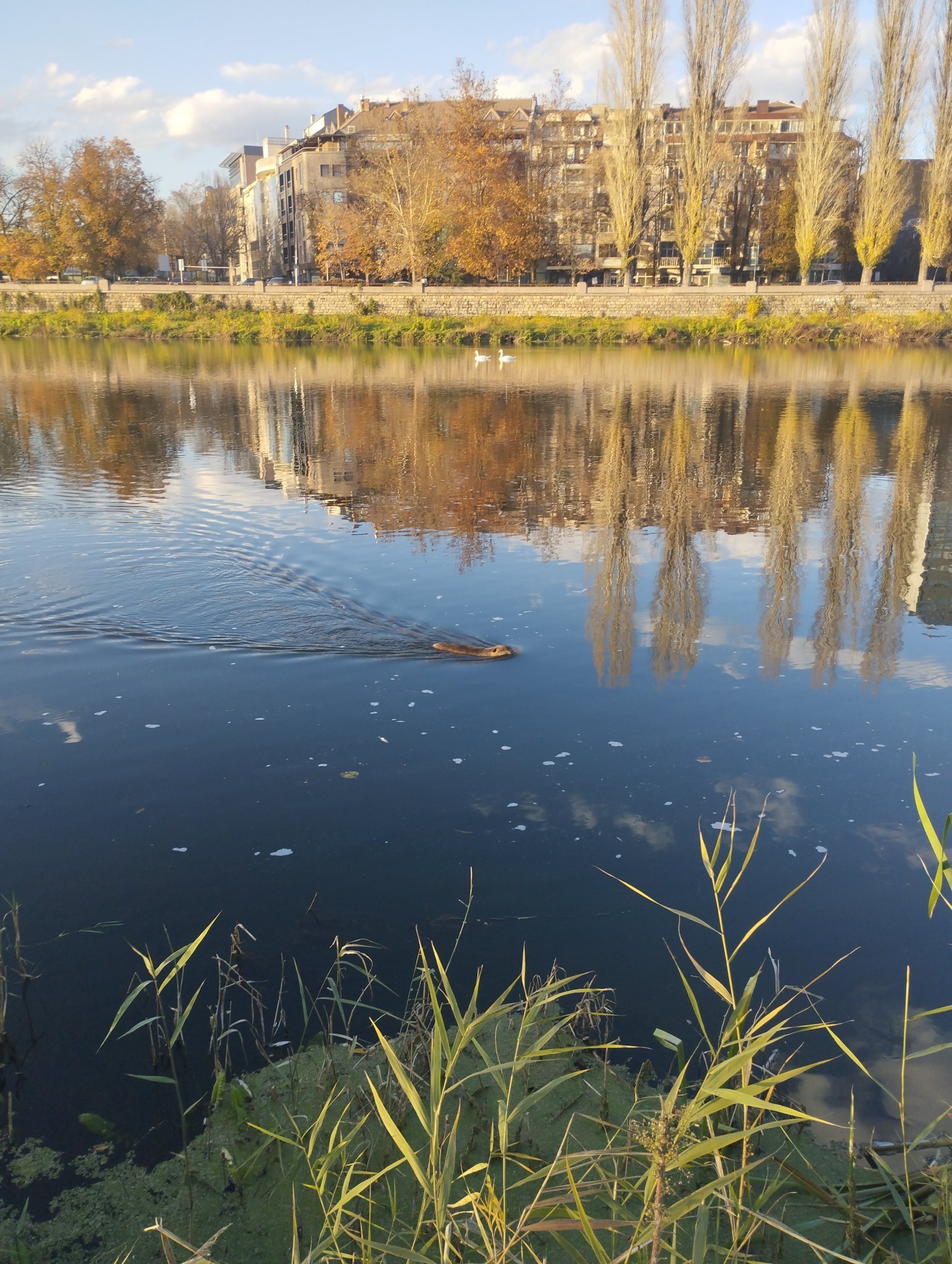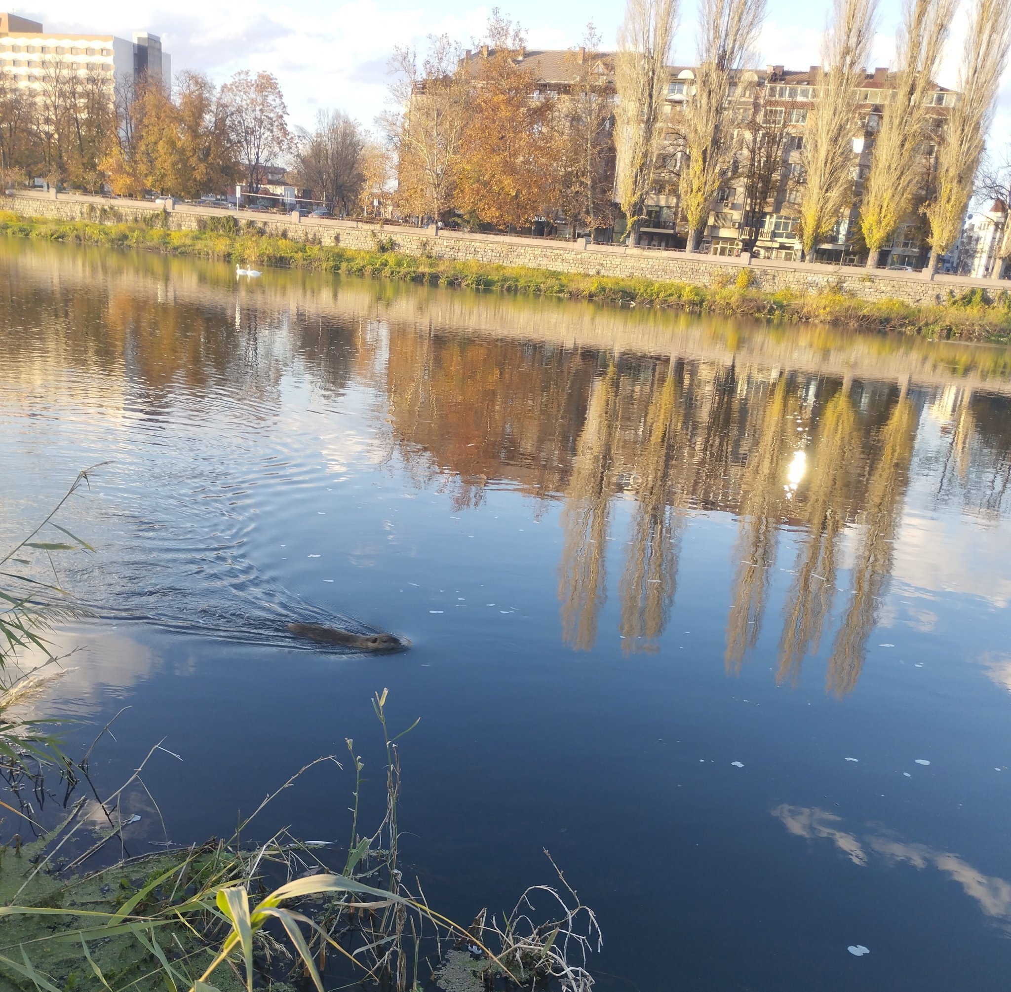 Днес си проветрявах главата и успях след много дебнене, е, не отблизо, да снимам нутрията. Всъщност по-надолу по реката , докато я следвах, се оказаха две.