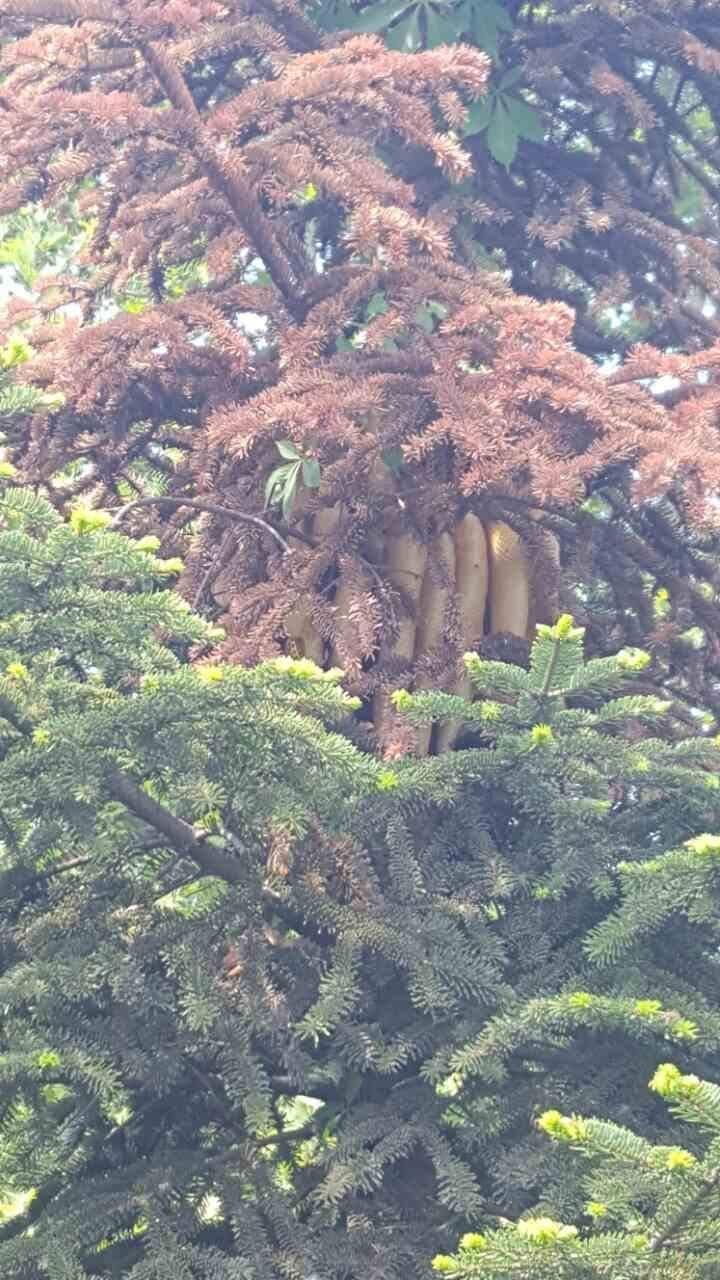 На третата снимка не знам дали ще го видите добре, но между кафявите и зелените клони се виждат едни жълти вертикални като салами неща. Това всъщност са пчелни пити и те бяха много големи, докато дървото не взе да изсъхва там, никой не беше забелязал пчелните пити.