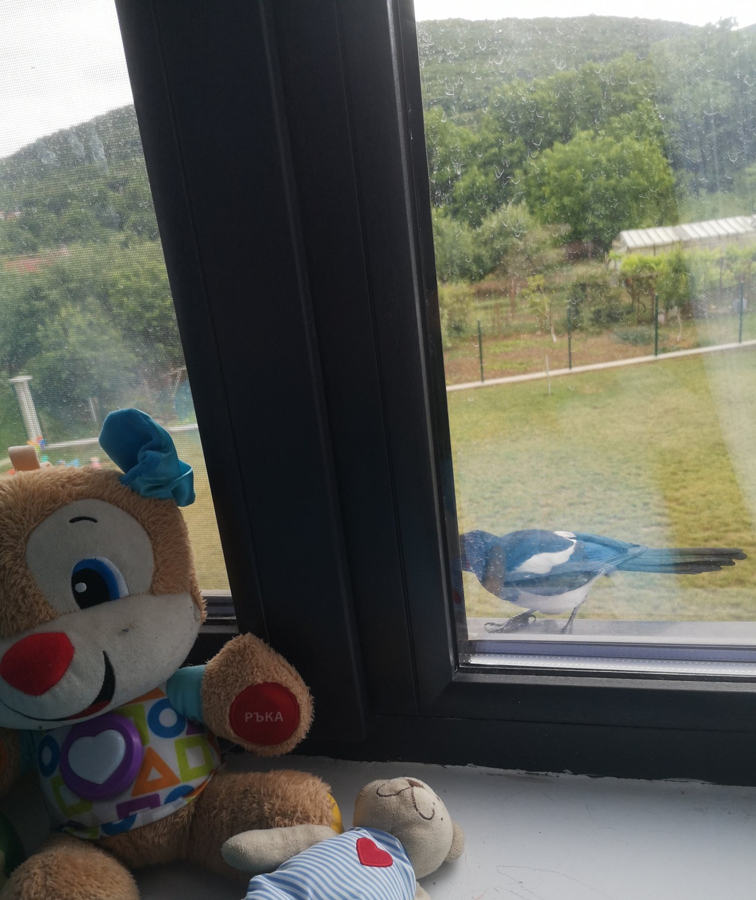Обикновено не мога да ги снимам толкова добре. Наскоро едно се засили право към затворената стъклена врата на терасата и се бухна в стъклото, след което избяга, но след малко се върна (затова предполагам, че не е пострадало). Така и не разбрах дали е искало да влезе, или е видяло отражението си и това го е изнерввило. За всеки случай сложих бяло тиксо на вратата - да се ориентират, че е стъкло.