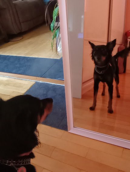 - купихме едно огледало, но докато пробием стената да го закачим, съм го подпряла на нея и ако не е на терасата, наш`та хубавица седи пред него и се наслаждава на чар-а си. По някое време и си ръмжи и си лае, но явно има и забележки...