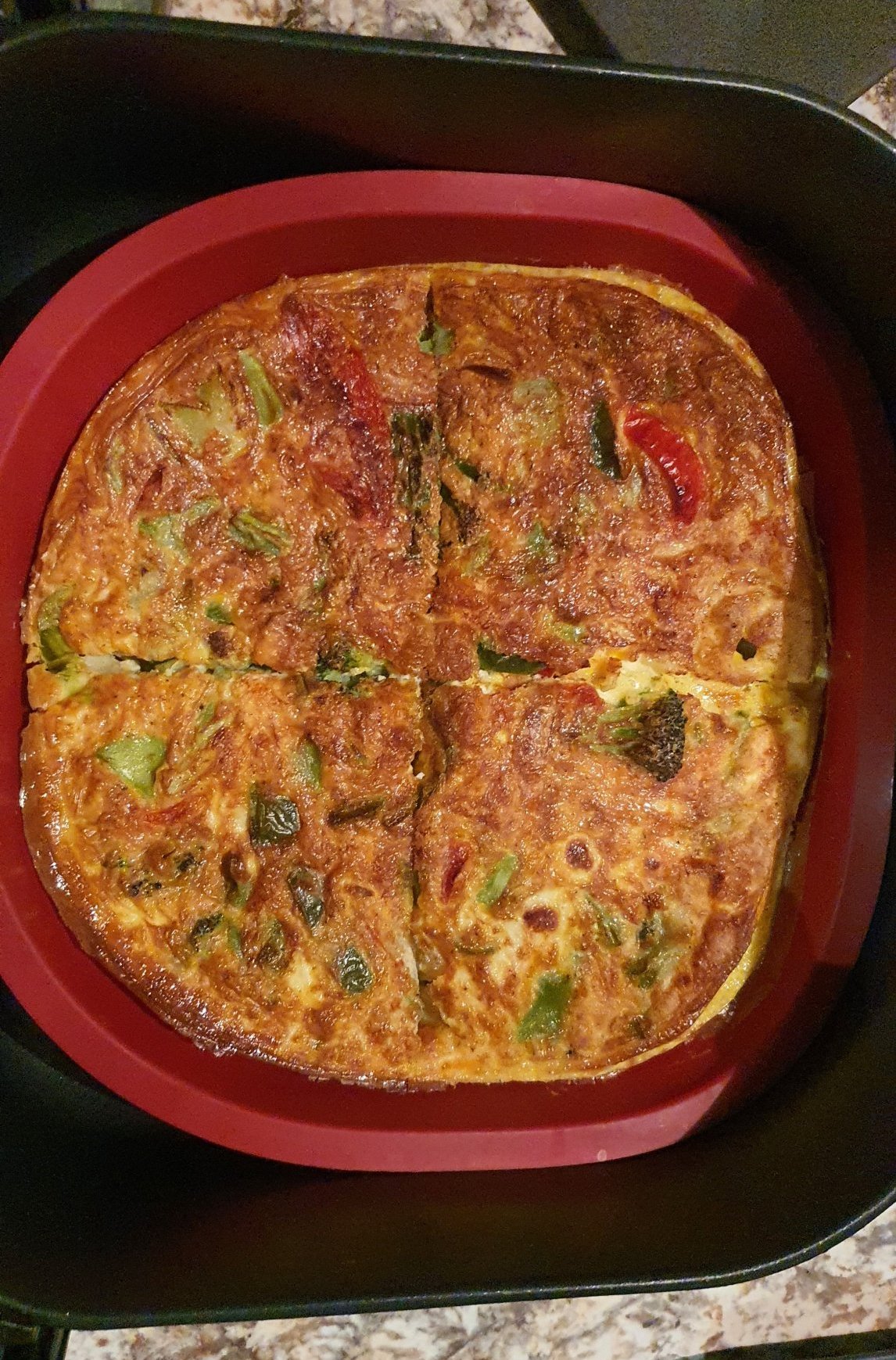 Всичко изброено по горе го смесвам в силиконова тава за печене и пека до златисто в ейр фраер на 180С.