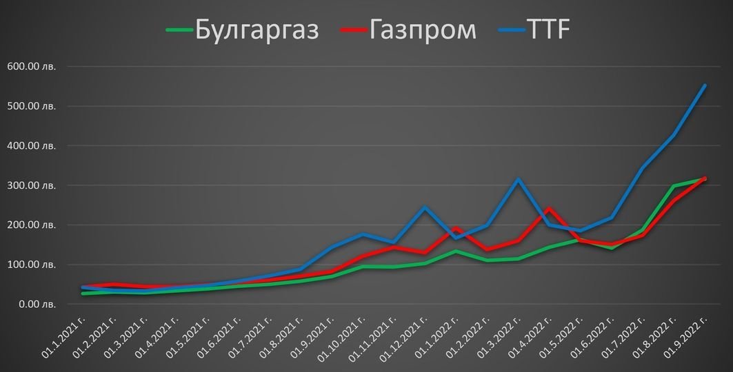 Я да я видим? Цената на Булгаргаз в периода в който получавахме газ от Газпром се изчислява по TTF месец напред, а графиката няма таймшифт