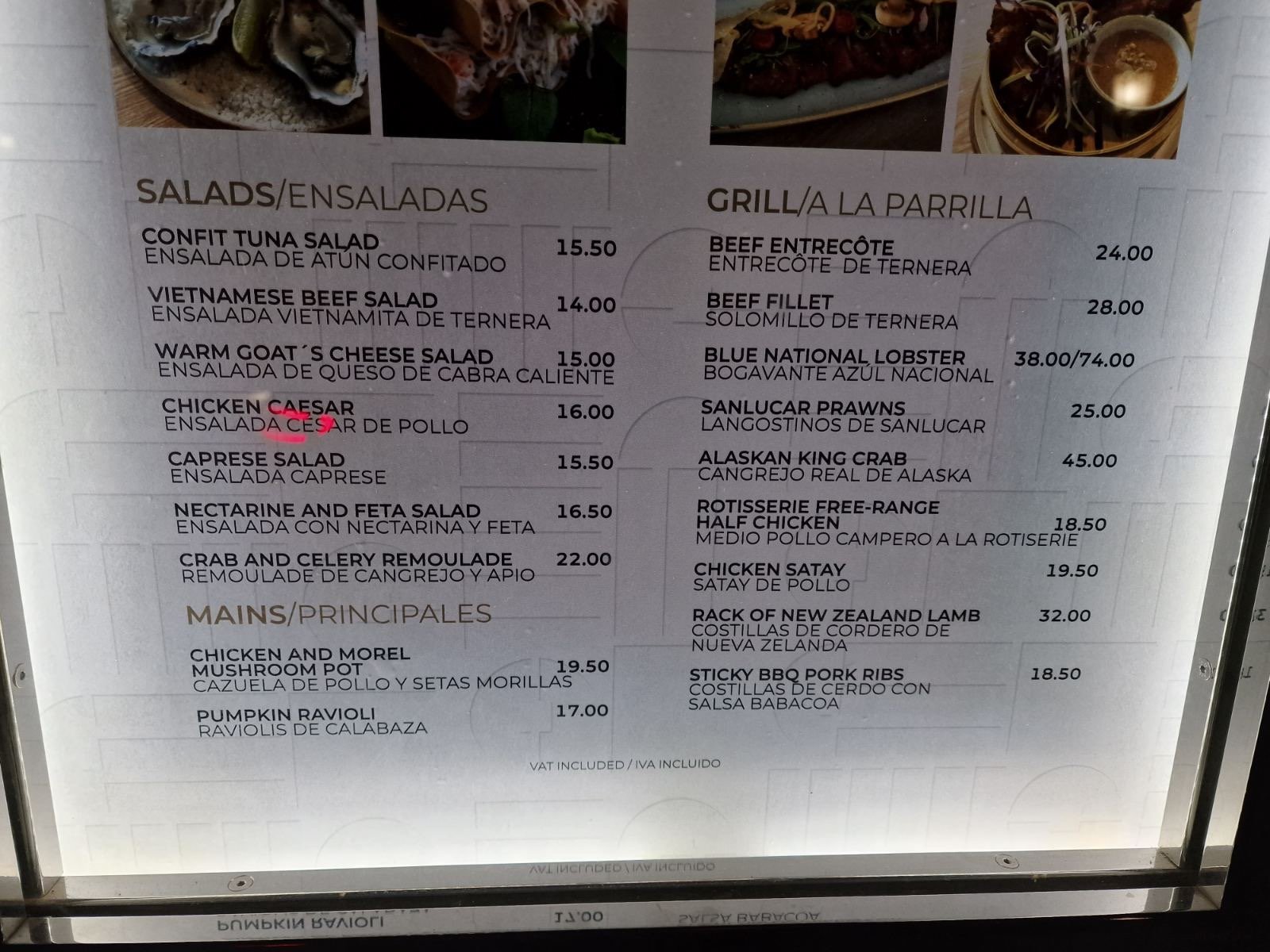 Аз споделям цените, които виждам сега. Всички цени, които написах са верни. Ето още малко относно салата Цезар и пици. Добре е да се видят и цените на спагетите. Лично на мен ми е доста по-скъпо в Испания спрямо България. И на двете места живея и се храня по подобен начин. Да не отварям дума колко струва годишната подръжка на имот. За охрана, озеленяване, боклук и данък на имота плащам около 1000 лева месечно. Едното заведение е с  добри цени, но порциите са малко по-малки.