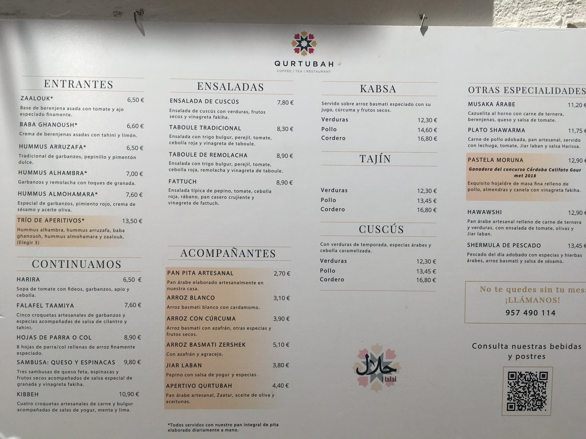 Ако знаех, че само на снимки вярвате, щях да щракам навсякъде в Андалусия снимки от менютата. За съжаление имам само от едно заведение - марокански ресторант (не за бързо хранене!) в стария град на Кордоба, който толкова ни хареса, че се върнахме отново да ядем там. Беше супер вкусно, порциите не бяха големи, но млад здрав мъж с една салата и едно основно ще се нахрани.
