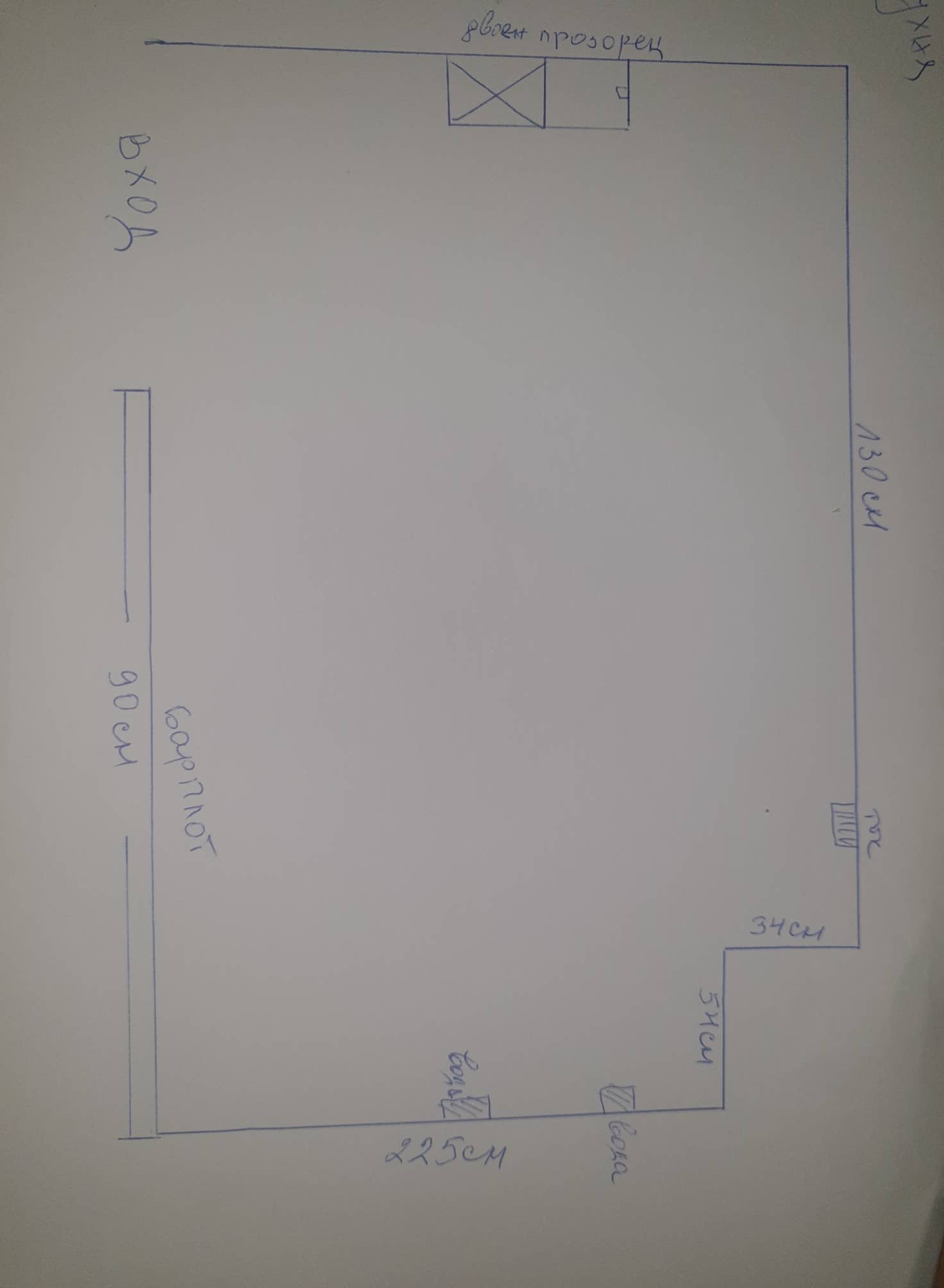 missence, скицата ти не е коректна - стената 130 см е изобразена като два пъти по-дълга от стената 225 см.  Виж моите предложения и коментирай, моля?
