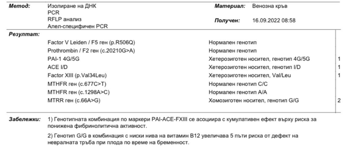 Имах сходен резултат. Първите две са най-сериозни,проф.Паскалева ще ти каже,че щом нямаш мутации там не е редно да се използва думата тромбофилия (поне при мен това сподели).Другите ти мутации имат кумулативен ефект и вече се гледат различни индивудиални фактори,кръвната картина и тн.Последната мутация е свързана с неусвоение на витамин B12,ще ти кажат да приемаш метилираната форма на витамина.Всичко ще бъде наред,това са евентуални рискове,които е хубаво да знаеш. Simple Smile От опит мога да кажа,не се шашкай…