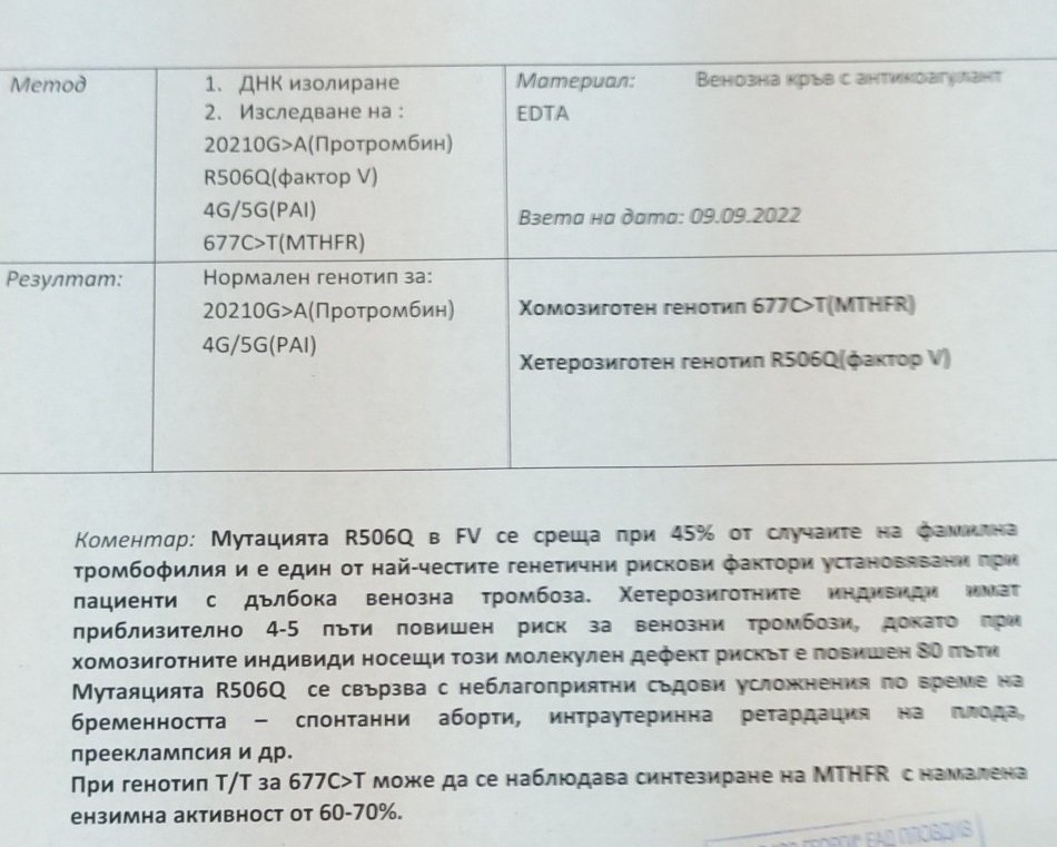 Имаш хетерозигот по високорисков фактор V. Добре е при следваща бременност да си на терапия с НМХ и да следиш стриктно кръвоток и коагулация, също да се следиш при специалист с опит в проследяване на бременни с тромбофилия.