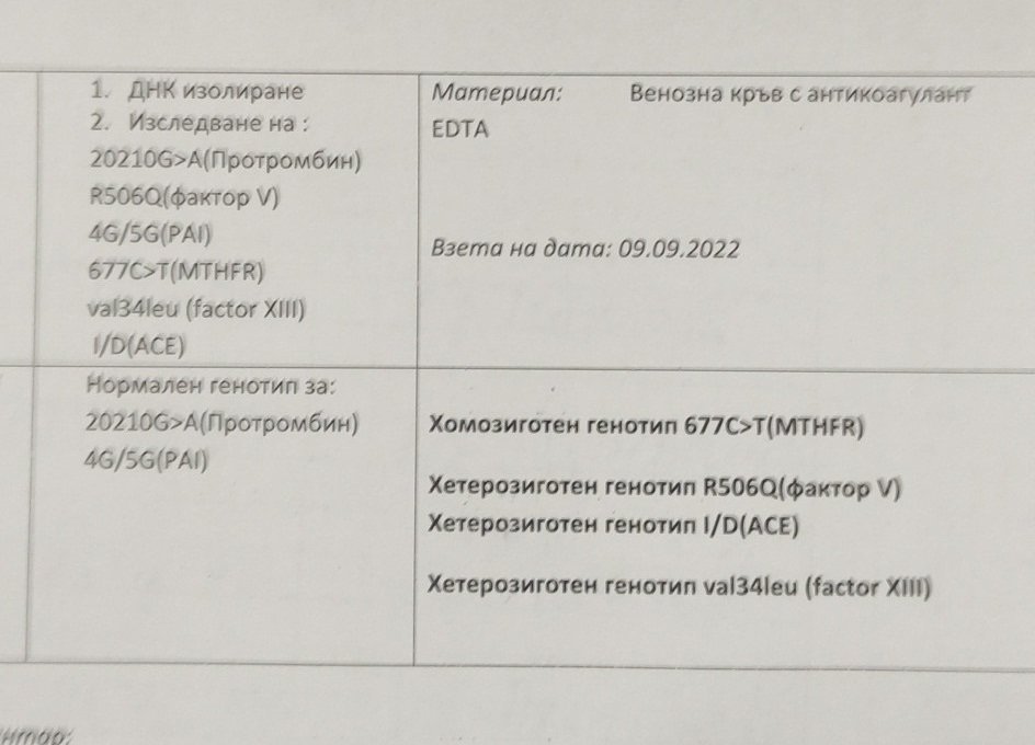 Днес също така ми излезнаха и още едни други изследвания за тромбофилия, които бях пуснала преди месец....много мутации , много нещо....