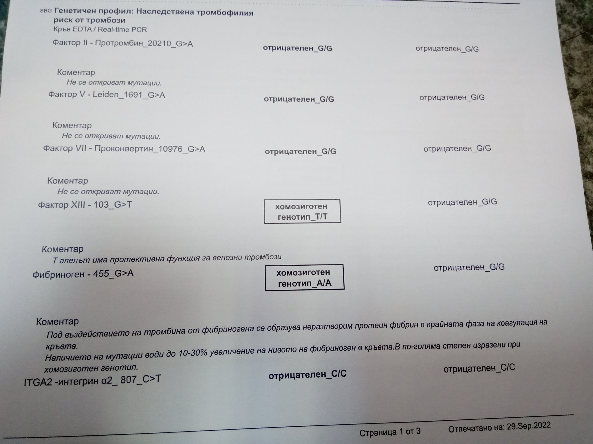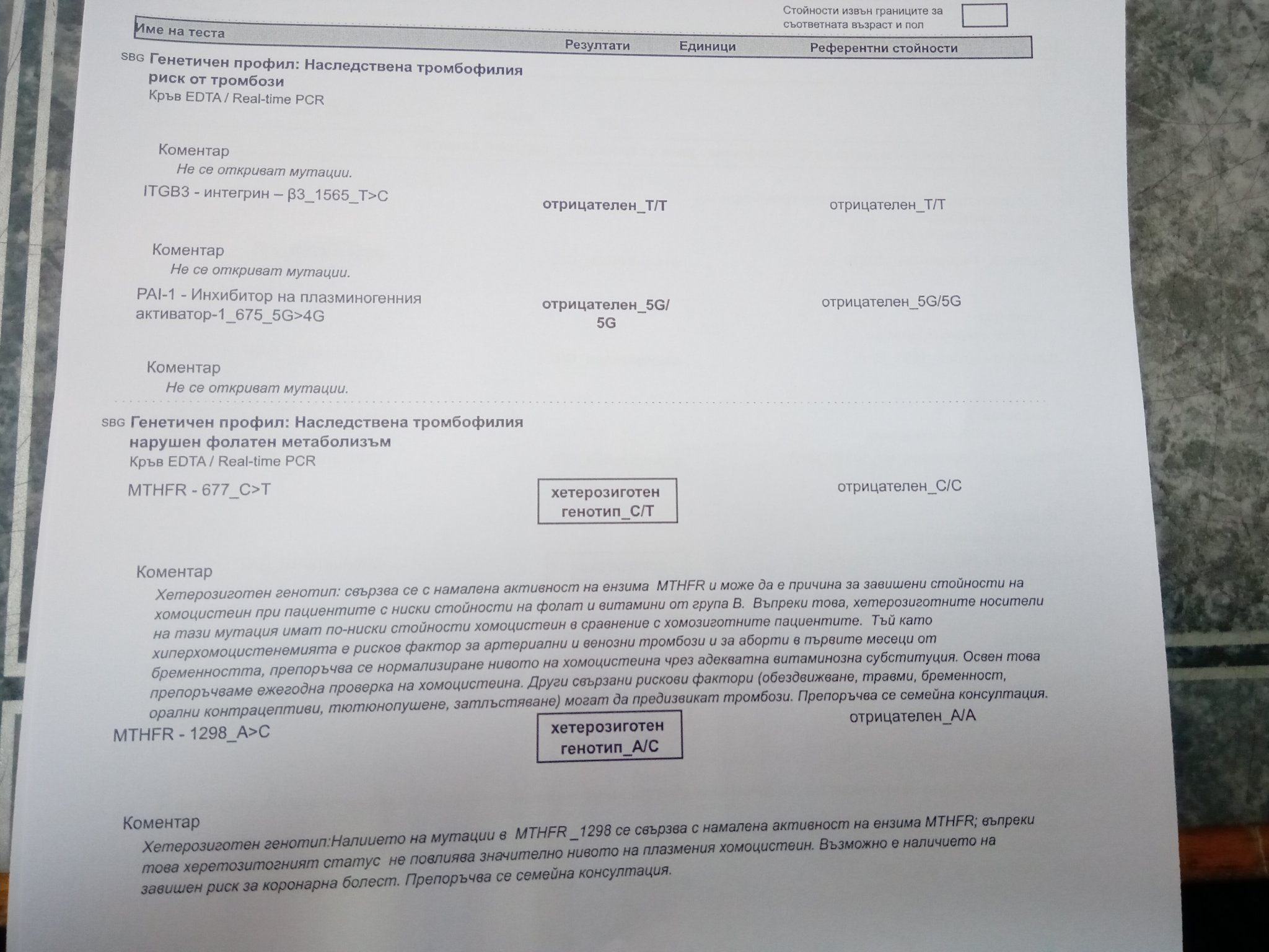 Моля ви за коментар на изследванията. За PAI - 1 пише "хетерозиготен носител 4G/5G", но коментарът е, че не се отчита повишен риск за венозни тромбози. Озадачена съм. Наличието на този тип 4G/5G не означава ли, че имам тромбофилия иили поне висок риск?