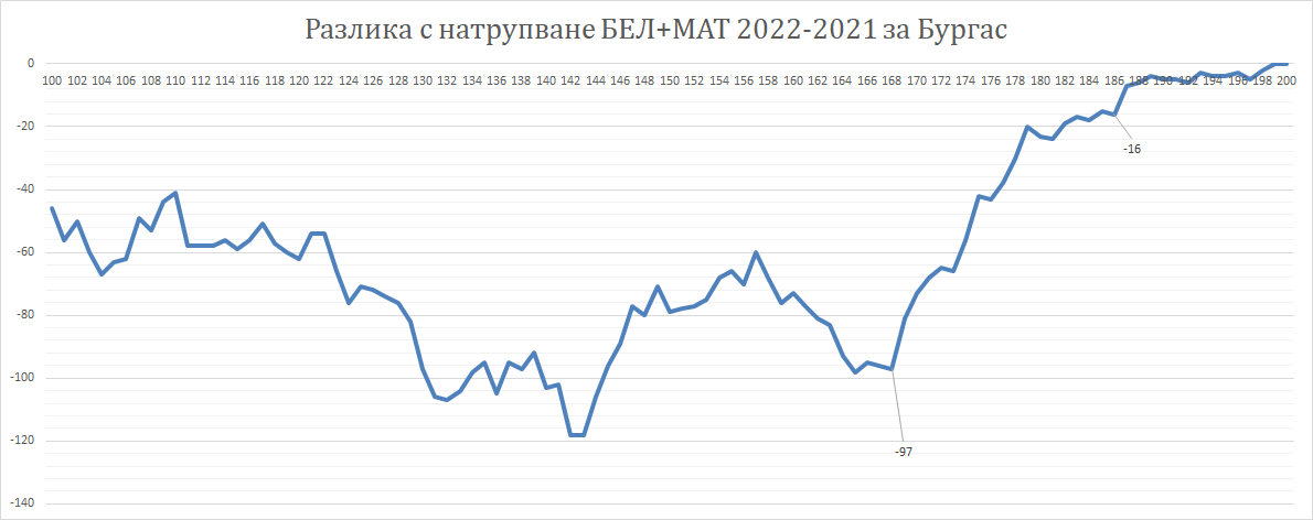 Разлика в брой с натрупване БЕЛ+МАТ 2022 спрямо 2021