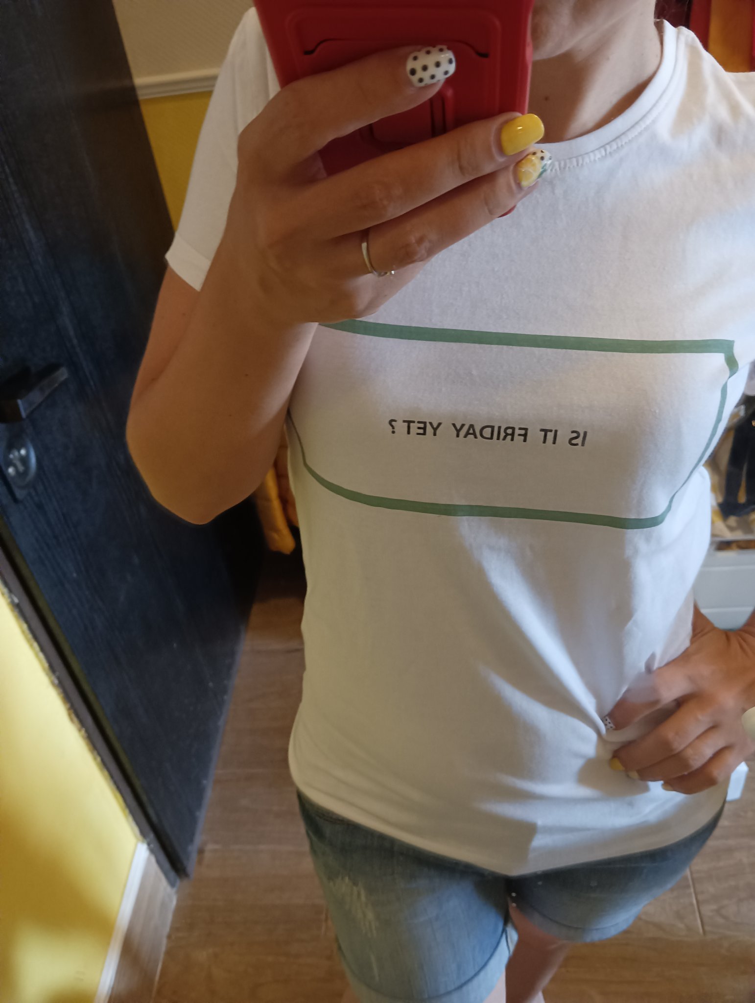 От детското - роклето 8лв , още се чудя дали това 164 не ми е голямо, ма бях с дребното и не съм пробвала, но може за вкъщна да си я нося. Тениската е 5 лв - Is it friday yet , ако не се чете , плътен памук.
