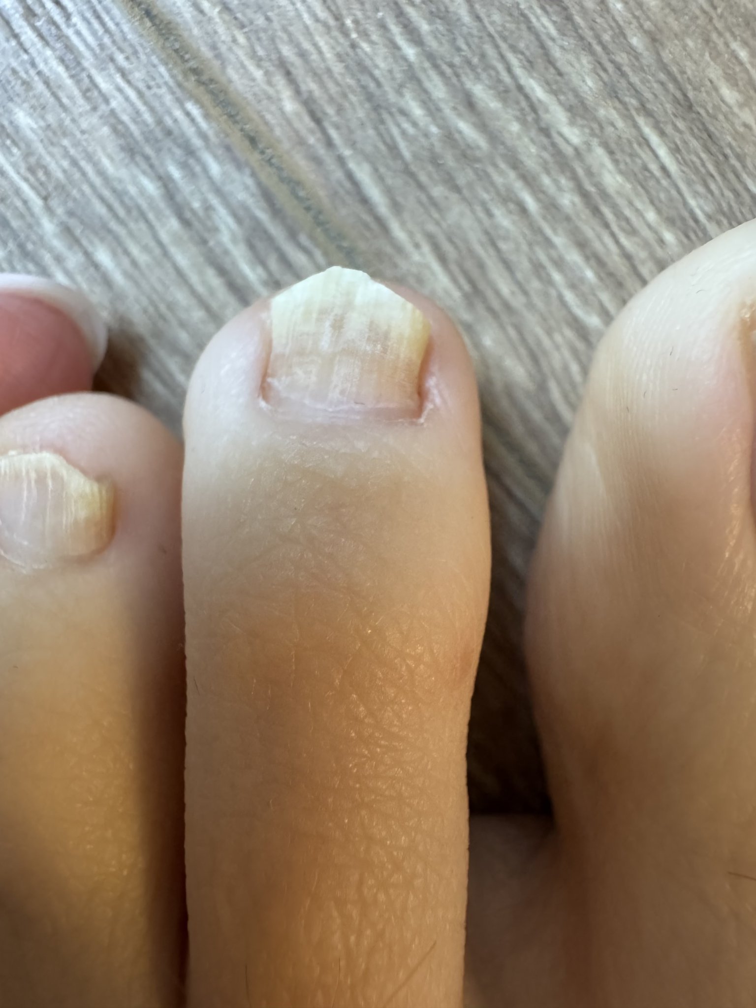 Ноктите на двата палеца на краката са засегнати. Отлепването е от едната страна почти до средата на пло