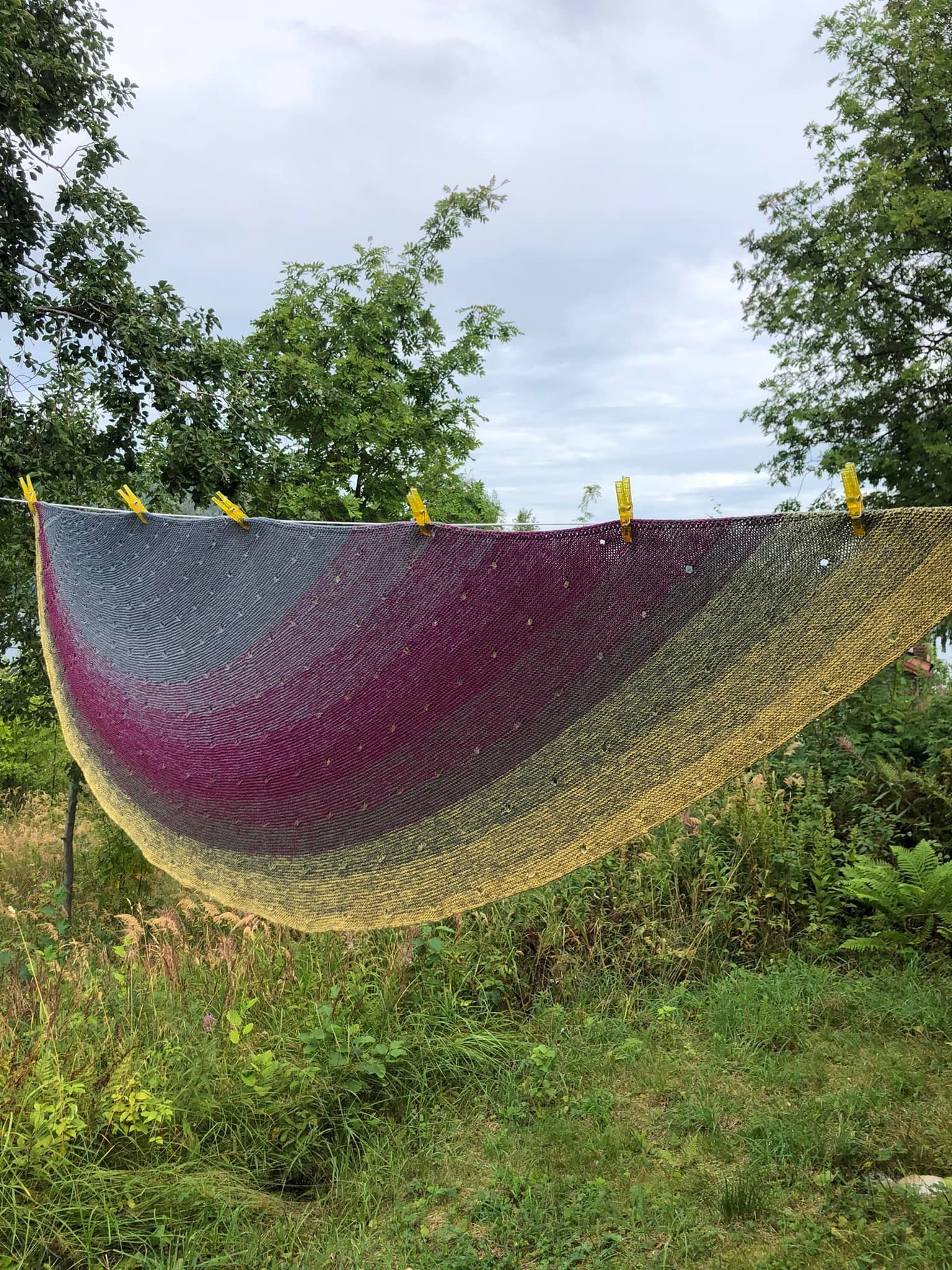 "This arched shawl begins at the center with only a few stitches while yarn over increases quickly expand the shape. Garter stitch short row wedges add length to one side forming rays that gradually increase in size. The repetitive knit stitches and rhythmic short rows are easy to work while still keeping your interest, a perfect travel project! Built in I-cord edges and an I-cord bind off outline the entire shape for a clean finish. Choose one yarn or use different stash and scrap yarns for a striped effect."
