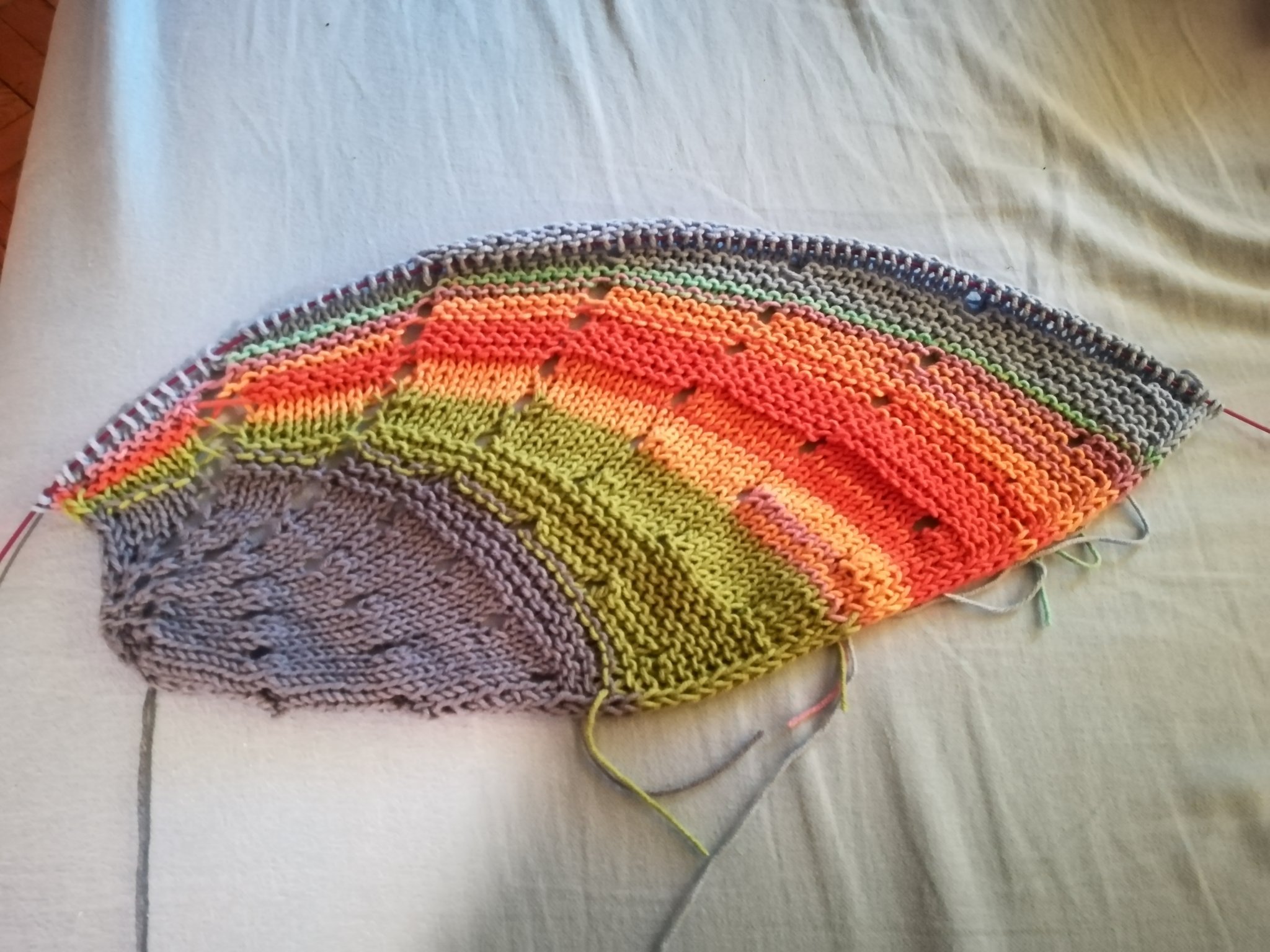 Дупчиците се виждат на всички редовете, не е съм го изпънала. Краищата са Айкорд. Наддавам на всеки лицев ред до ръба. Може би съм го започнала на повече бримки отколкото оригиналния и ще стане по-дълъг, но това не е проблем, едра съм 😉. Като стане готов, ще покажа. Нямам много време за плетене..