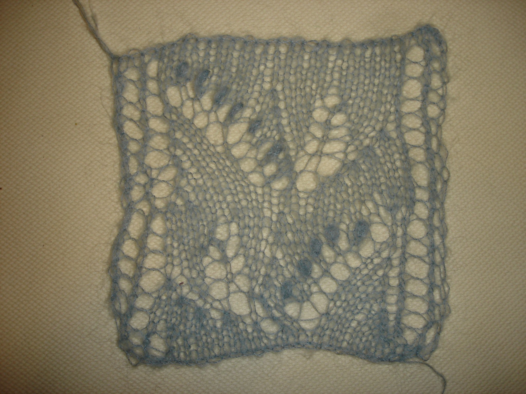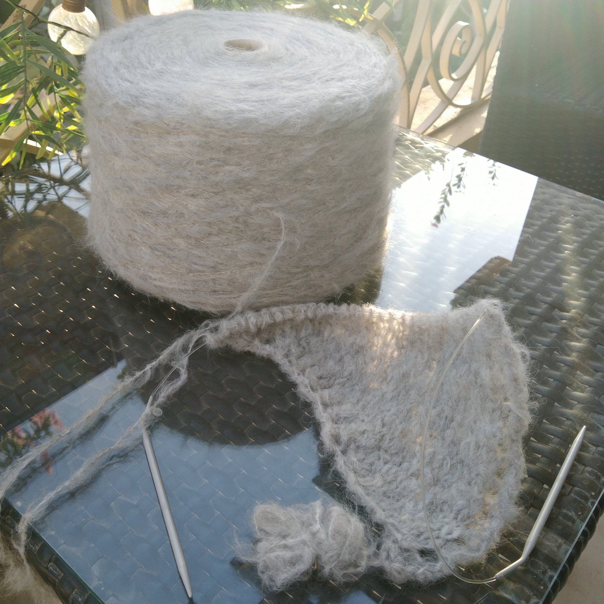 Аз имам една много тънка на бобинка, бях пробвала преди 2 зими да си плета дантелен оренбургски шал. Ама нали съм блейка, сбъркала съм с един ред схемата, като и я преписвах, да ми е удобна и кой да забележи. Усетих се, чак като стигнах до другия ъгъл. От тогава си стои и чака да измъдря дали да продължа с грешката да стане дълъг правоъгълен шал.