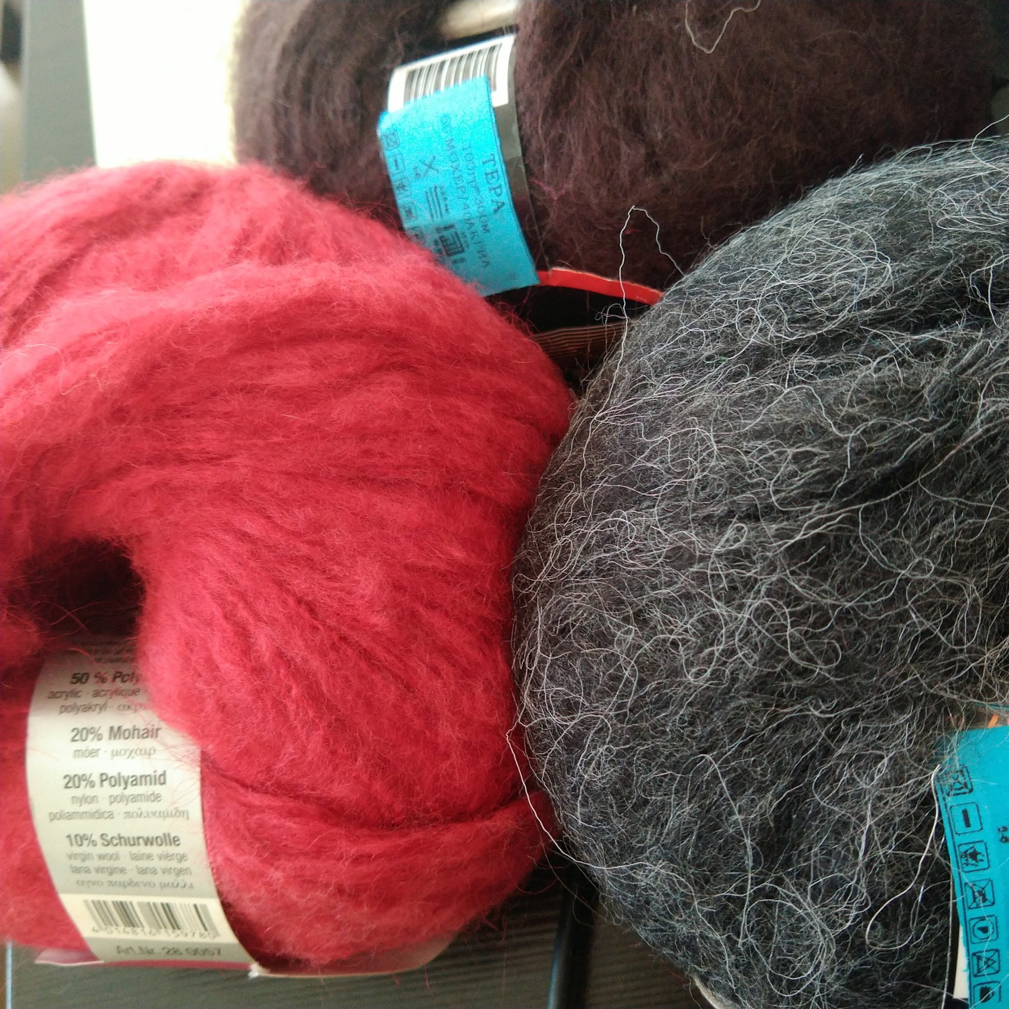 Кафявото и сивото са 60% мохер, 40 акрил, 100 грама 300 метра, но имам по две от всяко. Червеното е  20% мохер, 10% Лана, 50% полиакрил и 20% полиамид, 50 грама 200 метра, имам 5 по 50 грама.