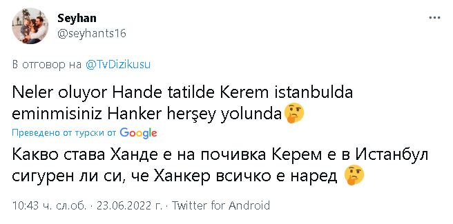 Като ги гледах и виждах привличане от самото начало. То толкова много си личеше. Керем какво ли не правеше на сета, за да я впечатли. Отстрани, който не е наблюдавал поведението и промяната при Ханде и как тя разцъфна като жена покрай Керем, ще си каже, че той е изглеждал по-влюбен. За мен си беше двустранно, просто Ханде беше по-обрана. Толкова много сме изписали по темата от февруари до края на март, "дисекция" на връзката им е направена. Гледам и Линдето се е включила с последнте събития от януари насам.