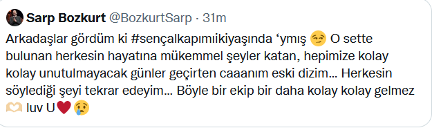 "Приятели, видях, че това е #sençalkapımıikiyaşında 😏 Моя скъпа стара драма, която добави прекрасни неща към живота на всички на снимачната площадка и ни накара всички да прекараме дни, които няма да бъдат лесно забравени… Позволете ми да повторя това, което всички казаха… Такъв екип няма да дойде лесно отново 🫶🏼 luv U"