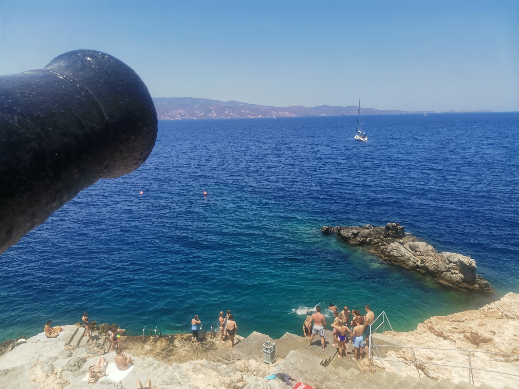 Този плаж е жесток на Хидра, то е силно казано плаж, едни циментови гнезда на етажи, а си излетял неправилно от гнездото, а си станал на кайма😂