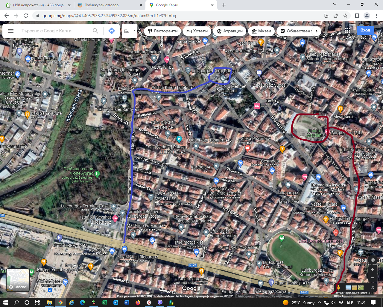 Ние, в последно време ходим само в Люлебургас и нямаме проблем с паркирането. Обикновенно паркираме пред джамията- от първият светофар в ляво, покрай автогарата - отбелязан е с лилаво. Другият вариант е закрития паркинг в центъра- отбелязала съм го с червено.