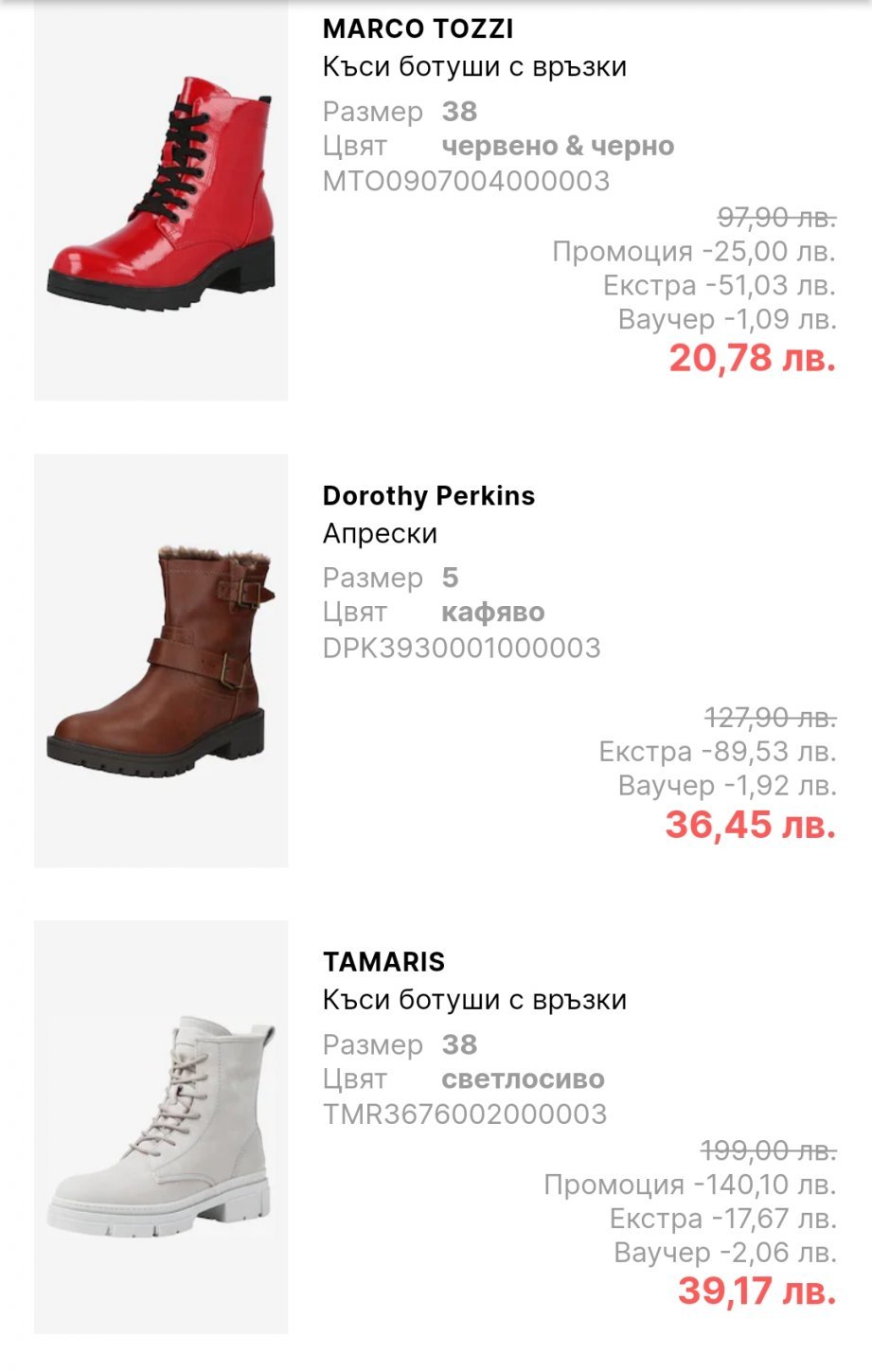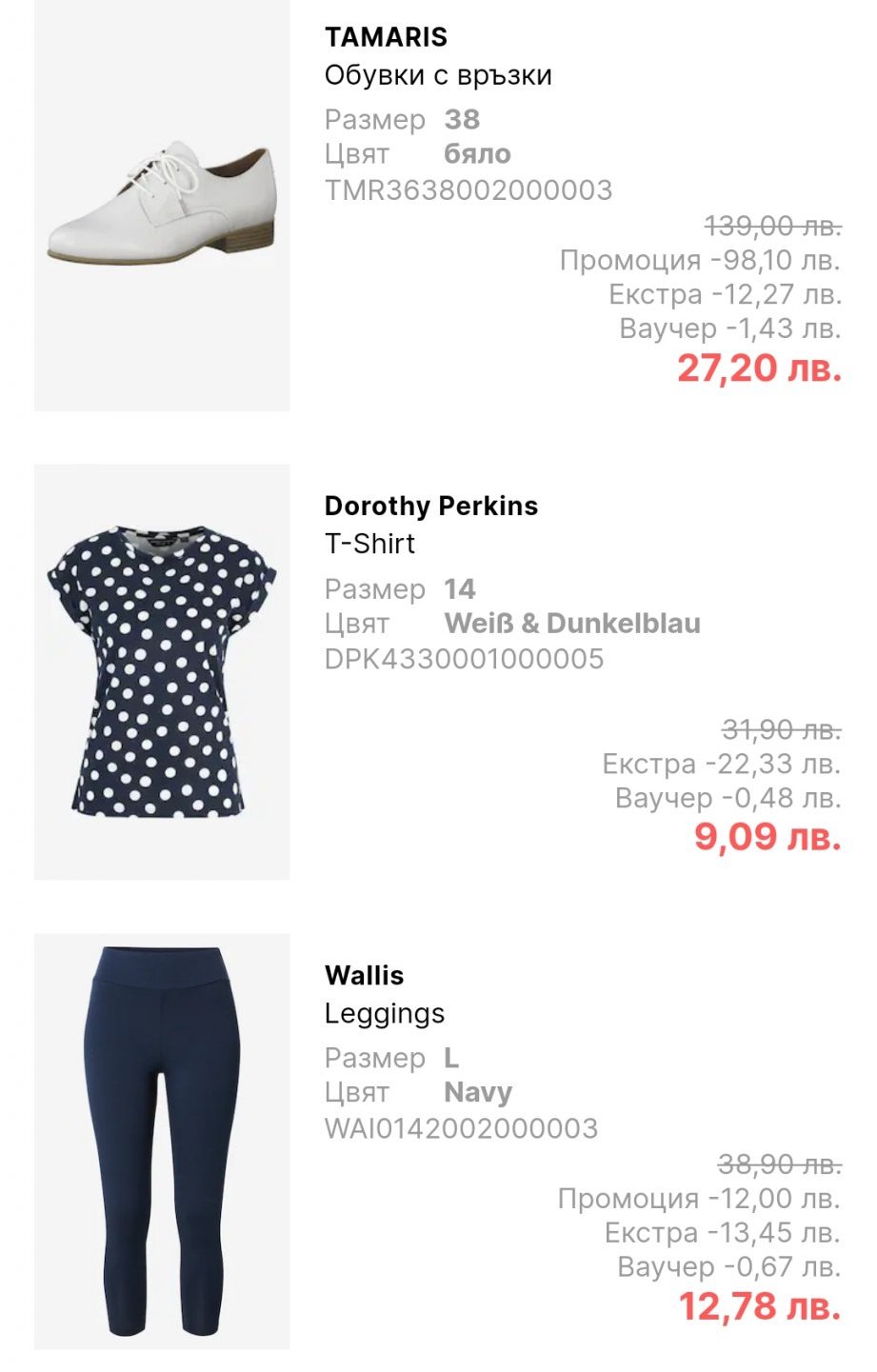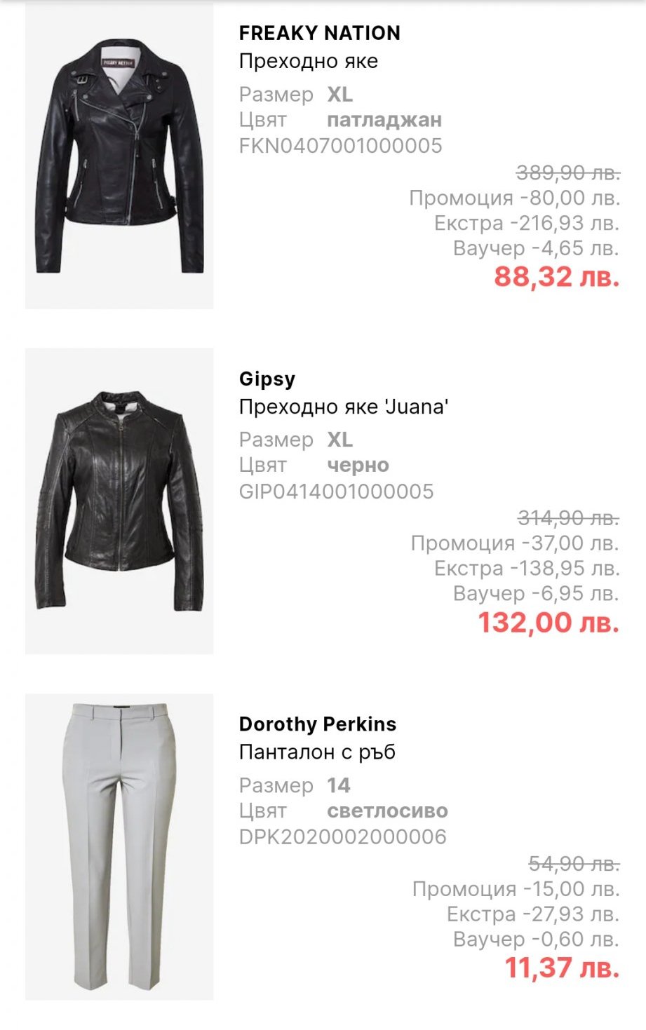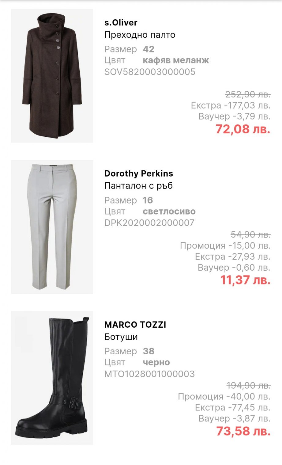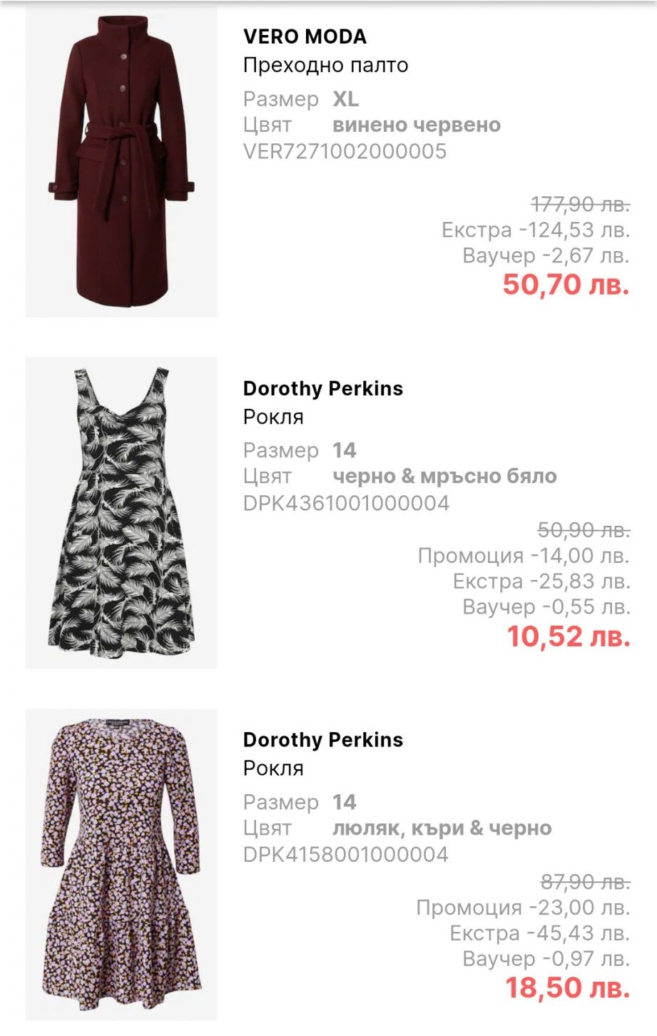 Тренч на Том Тейлър имам в тъмносиньо, невероятен е, отдавна чаках този цвят да падне под 100 лв. Роклята на Вила имам в небесносиньо с бяло, супер е, а на тази цена пък още повече. Роклите на Дороти Перкинс отдавна сидят в любими. Тъмно кафявото палто е невероятно! Имам вече 3 броя от този модел в различни цветове, много е удобно, визуално вталява. Боти на Дороти кафявите някой коментира в темата че са хубави май, или се бъркам. Другото не го знам, ще видим. Кожените якета ще са хубави 100%, само това на Gipsy не знам. Исках черно кожено яке с черни ципове (да не са бели или от др.цветове),и да е точно такъв модел. Ботушите надявам се да станат за широк прасец, че нямам нито едни, не мога да намеря подходящ модел.