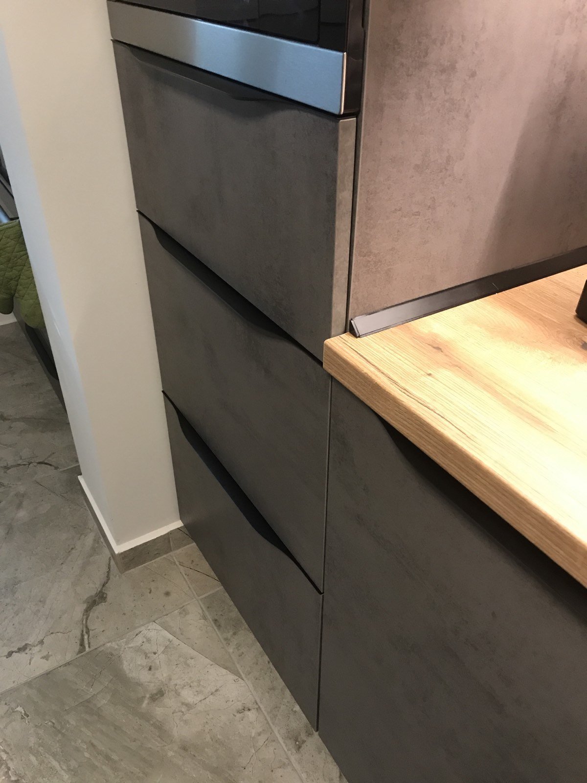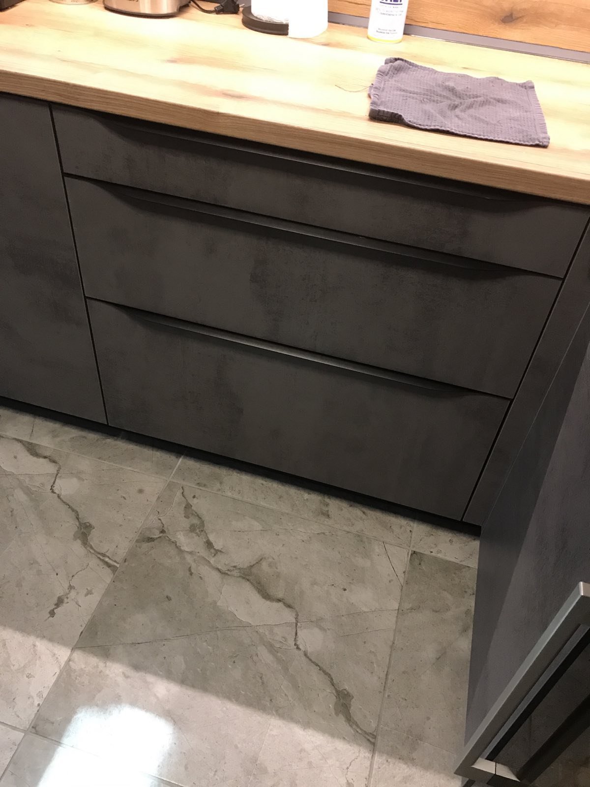 Кухнята е изчистена, в тъмен графит, със светли плотове. Акцентите на помещението са черни, така че търся черен мат. Ще ми се да са по-масивни и по-дълги. Близо до това
