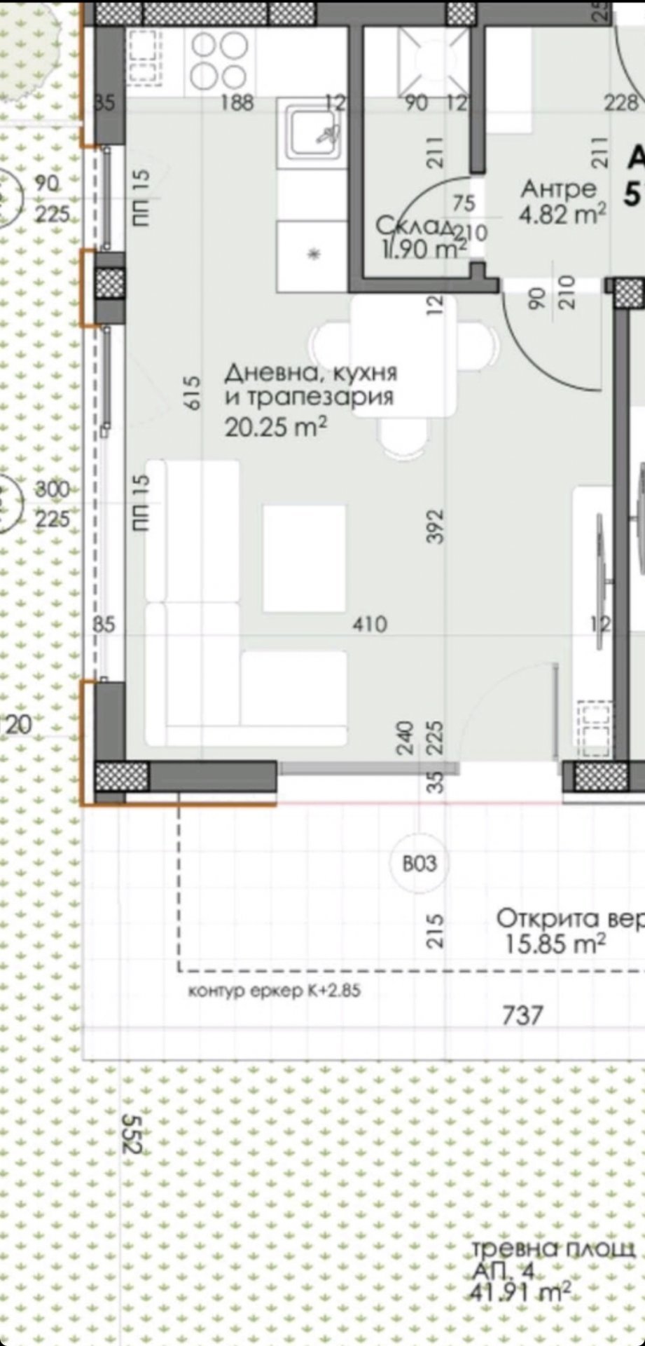 red soul, аз бих обърнала дивана да "гледа" към верандата. Срещу него нисък ТВ шкаф за телевизора, а кухненската маса бих я сложила зад дивана. Така, както е позиционирана на проекта е адски неудобна, точно на пътя към кухнята, трябва да я заобикаляш. А за самата кухня не виждам как може да стане по-голяма.