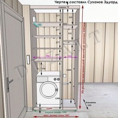 Така като гледам, тази мебел тип гардероб спокойно може да бъде широка 120 см. Така освен за пералнята и сушилнята, ще останат 50 см, които може да се използват за гардероб, вместо за слад. Зависи от навиците и количеството вещи в семейството.