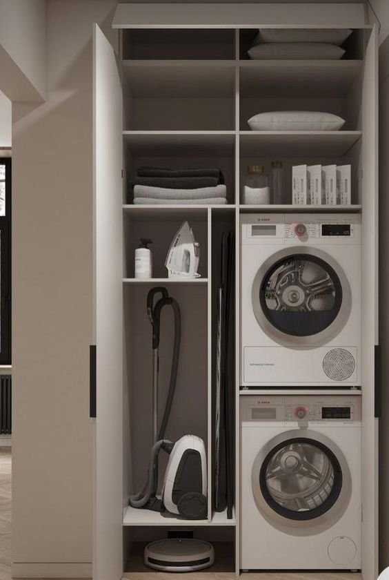 Складът го правите за пералня и сушилня една върху друга обърнати към антрето. Там ми се струва, че има място да е малко по-дълбоко, така че на вратата да закачите метли, мопове, четки, както и кошници за почистващи препарати.
