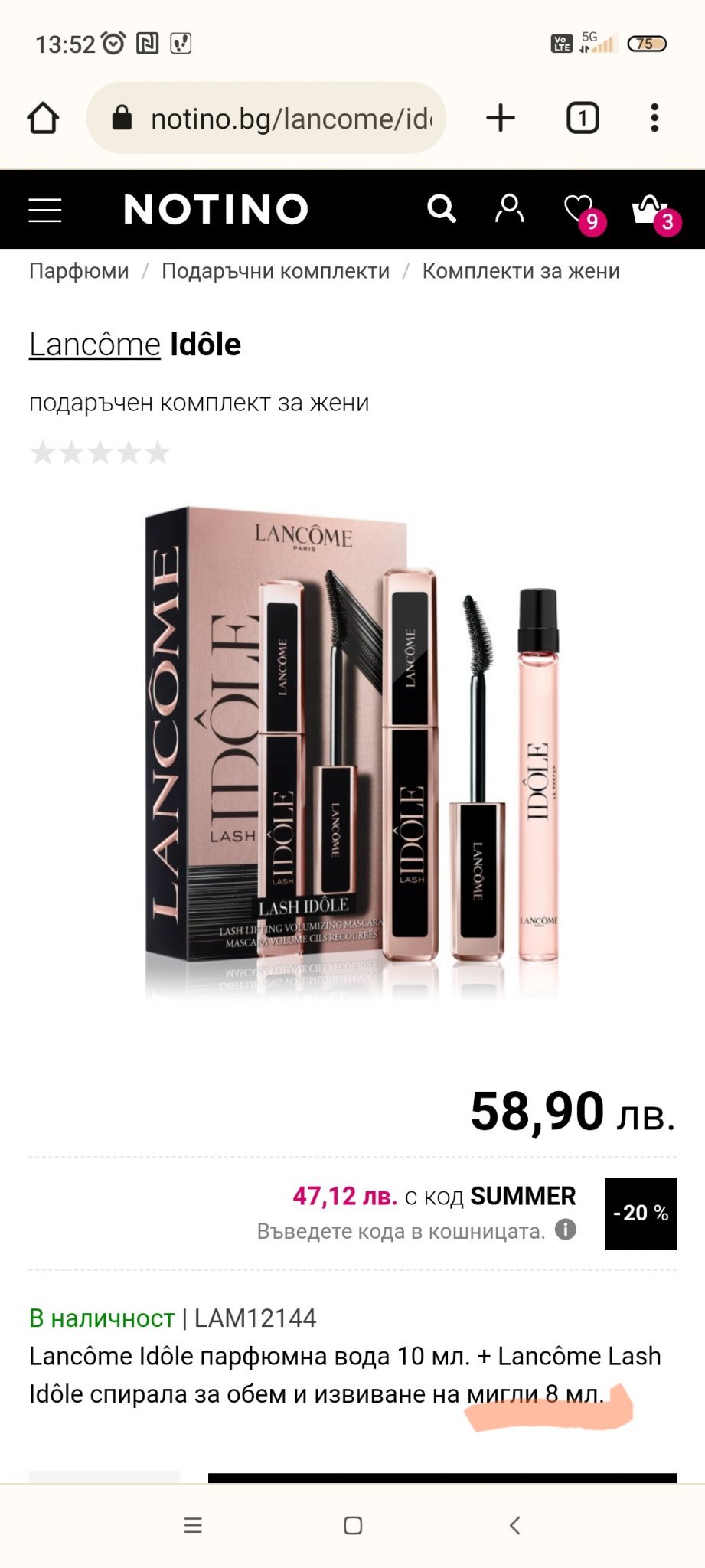 Някой беше споменал по назад в темата за комплект от Нотино с Идол и спирала. Получи ли ги някой от вас вече, да сподели дали парфюмчето е в отделна кутийка и дали са ок нещата? Чудя му се на този комплект дали ми трябва или да си поръчам спирала на Ланком по добре от Парфимо, гледам тази хубава оферта: