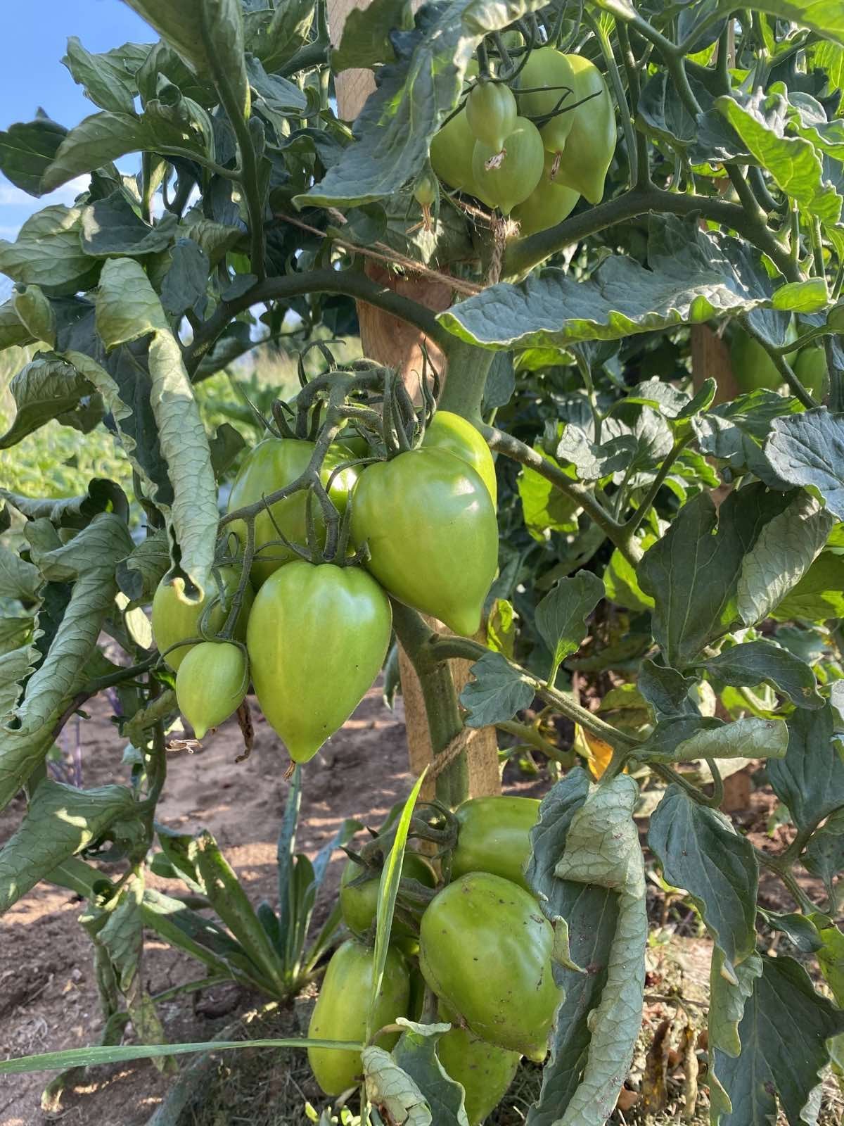 Аз в момента съм на ръба на нервна криза. Това да връзваш 53 кола домати, с техните колтуци си е голяма играчка. После ще поливам .. и ще се мръкне. И колтуците навързали, имаше паднали на земята, домати почти стигнали мрежата... Да минат жегите и ще им я махна. Но е приятно прохладно под нея.