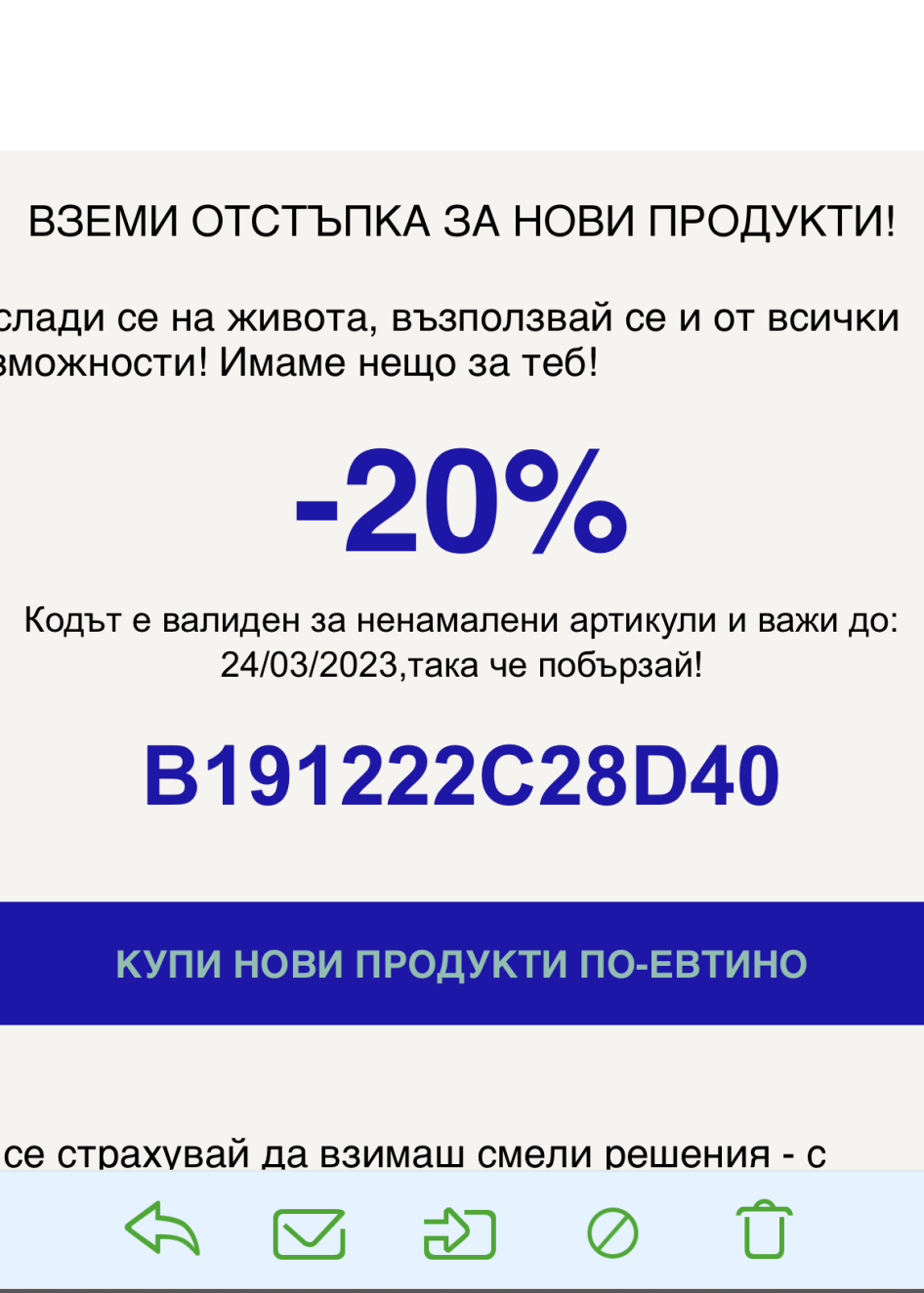Здравейте, моля, ако някой има код, който няма да ползва за ненамалени продукти, които не влизат в промоцията с код spring, да ми пише ЛС. Харесала съм си една раница, но ми идва доста скъпа, ако няма намаление. Благодаря Simple Smile