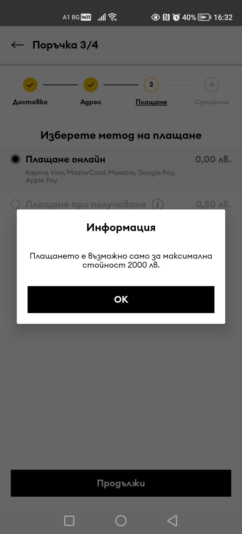 При мен няма никакво значение какъв адрес задам, домашен или офис на куриер, за плащане имам активна опция само онлайн с карта..