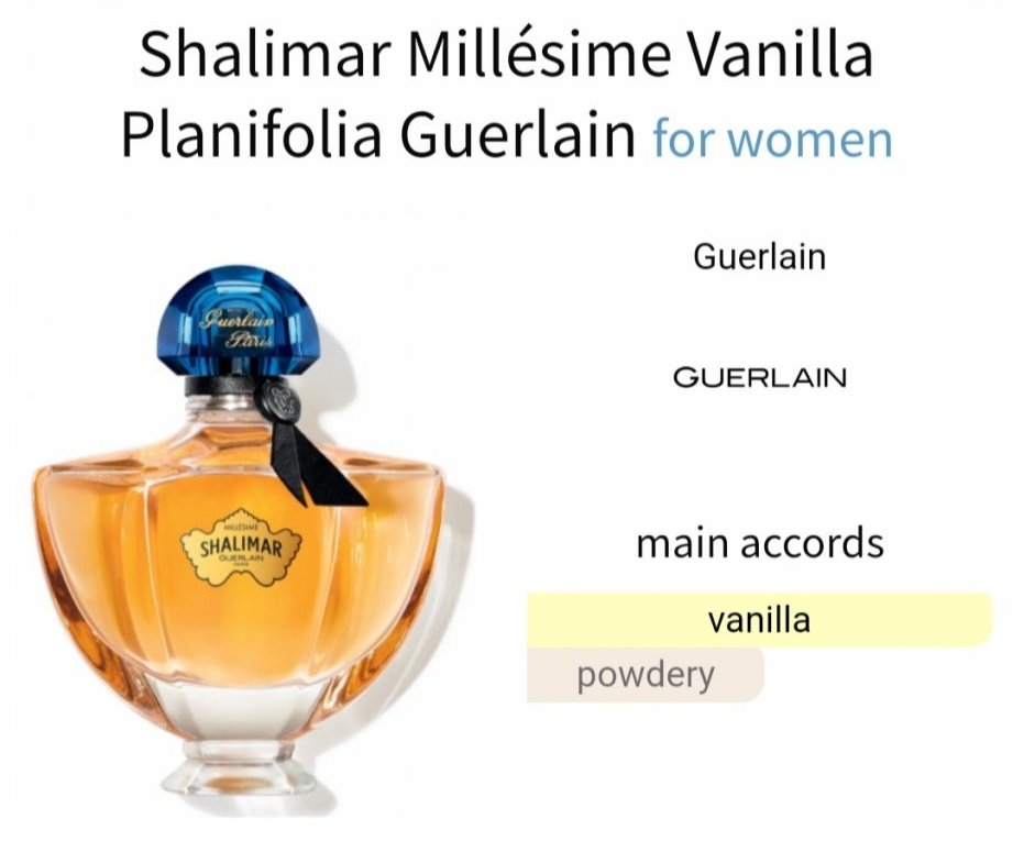 Five O'Clock Au Gingembre Serge Lutens, Shalimar Parfum Initial Guerlain, Shalimar Parfum Initial L'Eau Guerlain, Shalimar Parfum Initial L'Eau Si Sensuelle Guerlain, Sensuous Noir Estée Lauder, Sensuous Nude Estee Lauder, Bronze Goddess EDT и EDP, BLV Notte Pour Femme Bvlgari, Gaultier 2 Eau d`Amour Jean Paul Gaultier, Drôle de Rose L'Artisan Parfumeur,  Noir Exquis L'Artisan Parfumeur,  Vanille Vanille M. Micallef, Valentino Donna Born In Roma, Jour de Fete L'Artisan Parfumeur, Lipstick Fever Juliette Has A Gun, Dark Vanilla Montale, Montale Orchid Powder, Aoud Orchid Mancera , Wonder Bouquet Mugler, Alien Goddess Intense Mugler , Nivea Sun Nivea, Musc Noir Rose For Her Narciso Rodriguez и др.