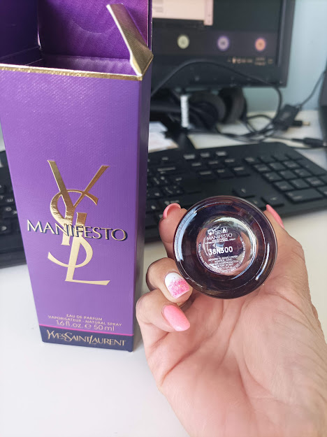 https://www.fragrantica.com/perfume/Yves-Saint-Laurent/Manifesto-15540.html  - опаковка 50 ml EDP с кутия. Манифесто е малко над половината от 50ml. Точно на нивото на пръстена е течността. Снимала съм количеството в бутилката, което предлагам:
