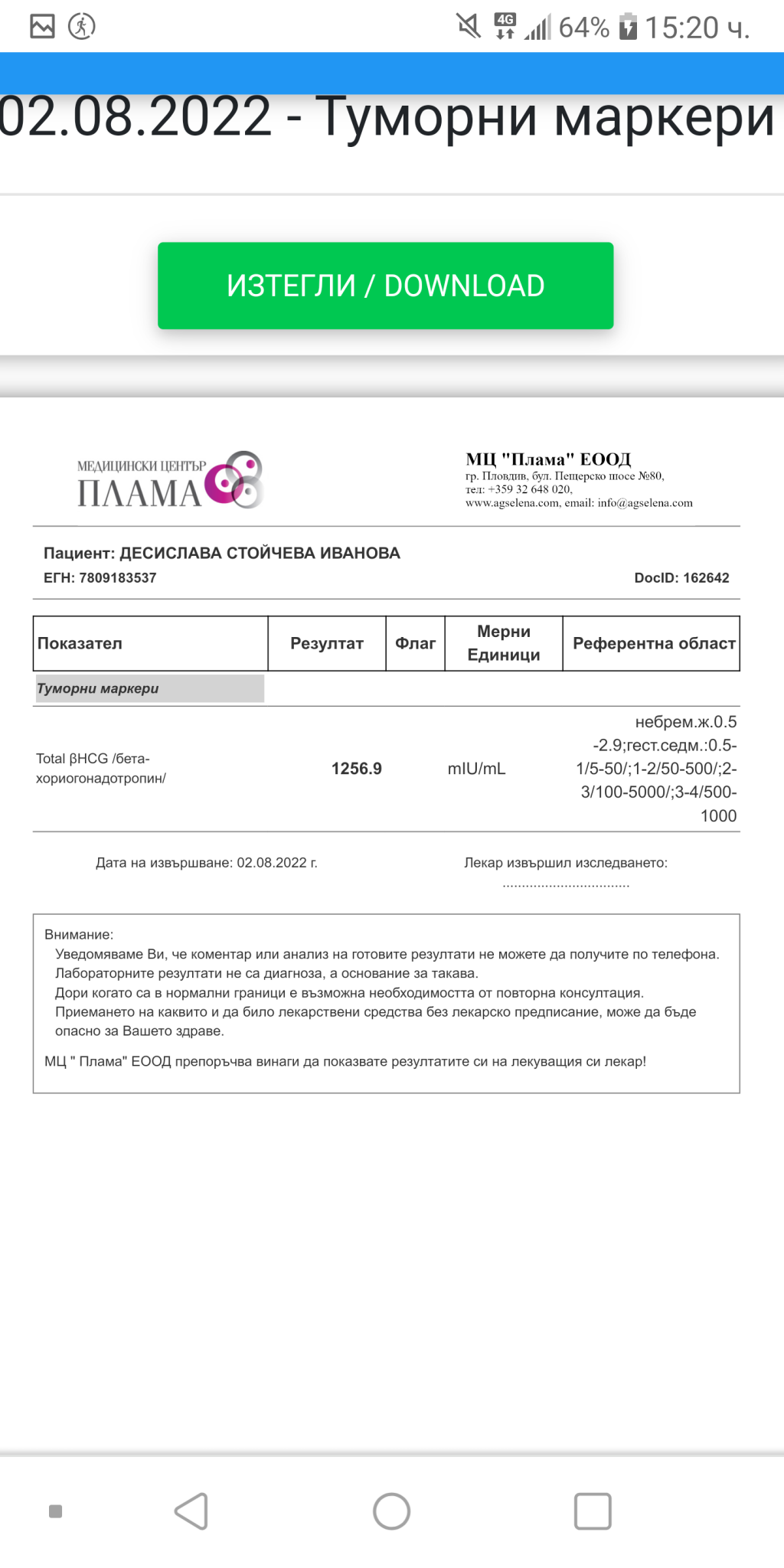 Следобяд бях при него видя нещо малко, което все още не иска да го коментира и ме изпрати за ново чхг.Резултата излезе и чакам пред кабинета му да го изкоментира, като още одеве каза да не спирам лекарствата, тъй като от вчера вечерта не съм взимала нищо.....