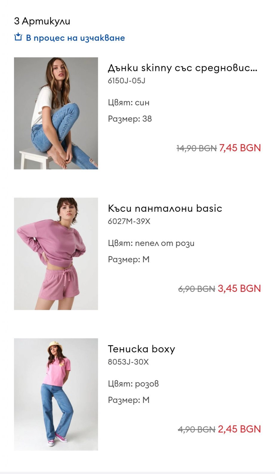 Аз харесвам дънките, но едните са размер 40, другите 42 (това беше останало), а аз май съм 38. Но ако ми станат или са леко широки, за по 10 лв, ще си струва. Освен това, може да се свият...