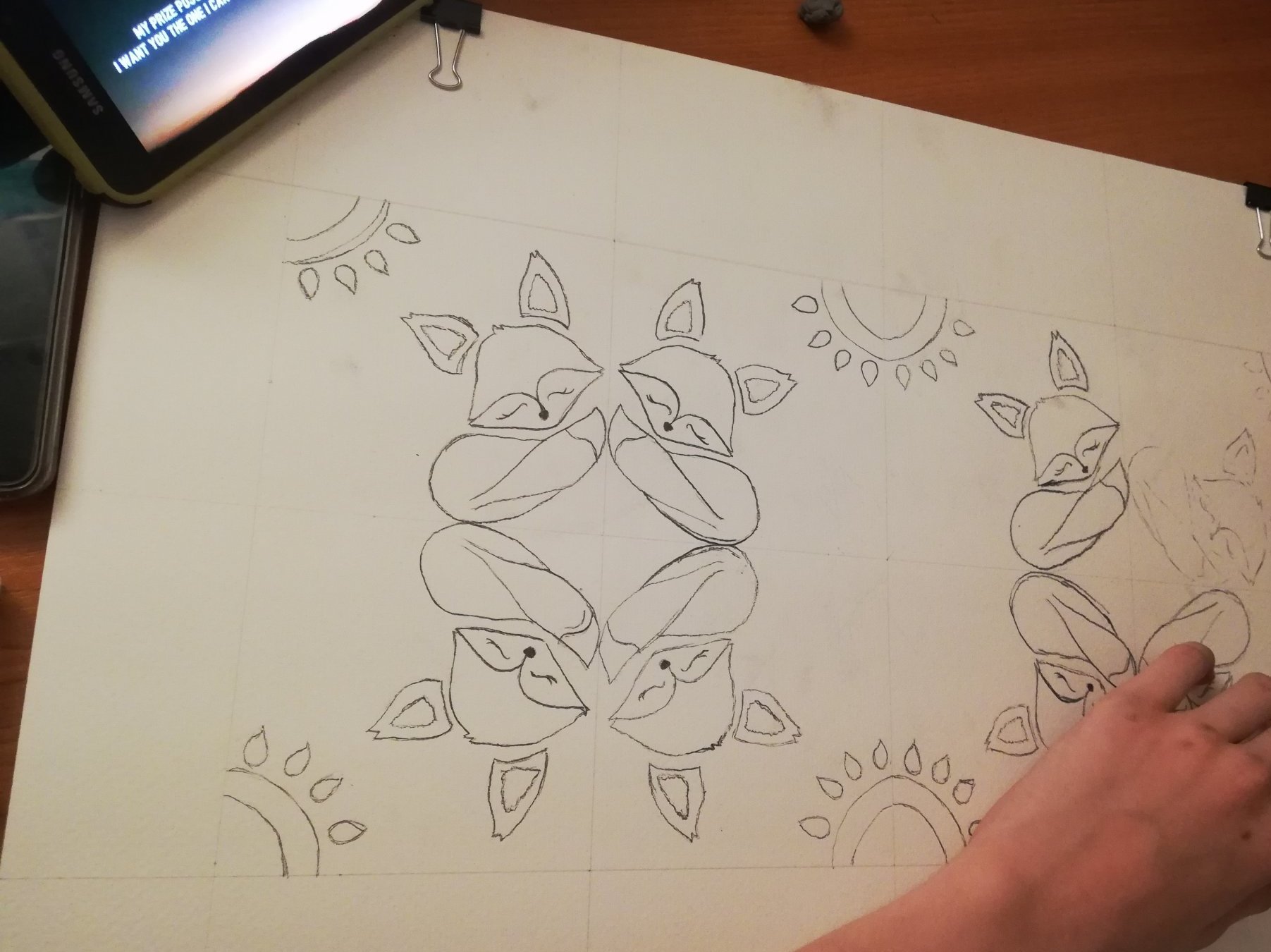 В мрежа от 8 квадрата 10/10 се рисува повтарящ се елемент с ротация например... Мрежата трябва да е центрирана и квадратите точни размери... Момата рисуваше после с темперни бои