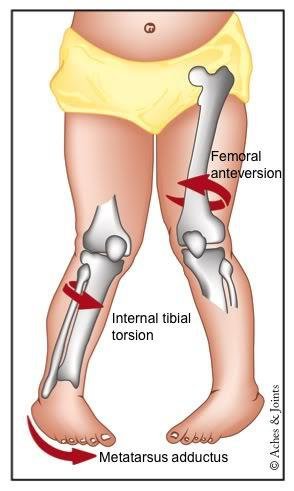 Кривината на долните крайници, или усещането за такава (пръсти, гледащи навътре), се дължи на т.нар. "феморално антеверсио". Което, и до определен ъгъл е нормално нещо, с произход от тазобедрените стави е, но се коригира с времето.