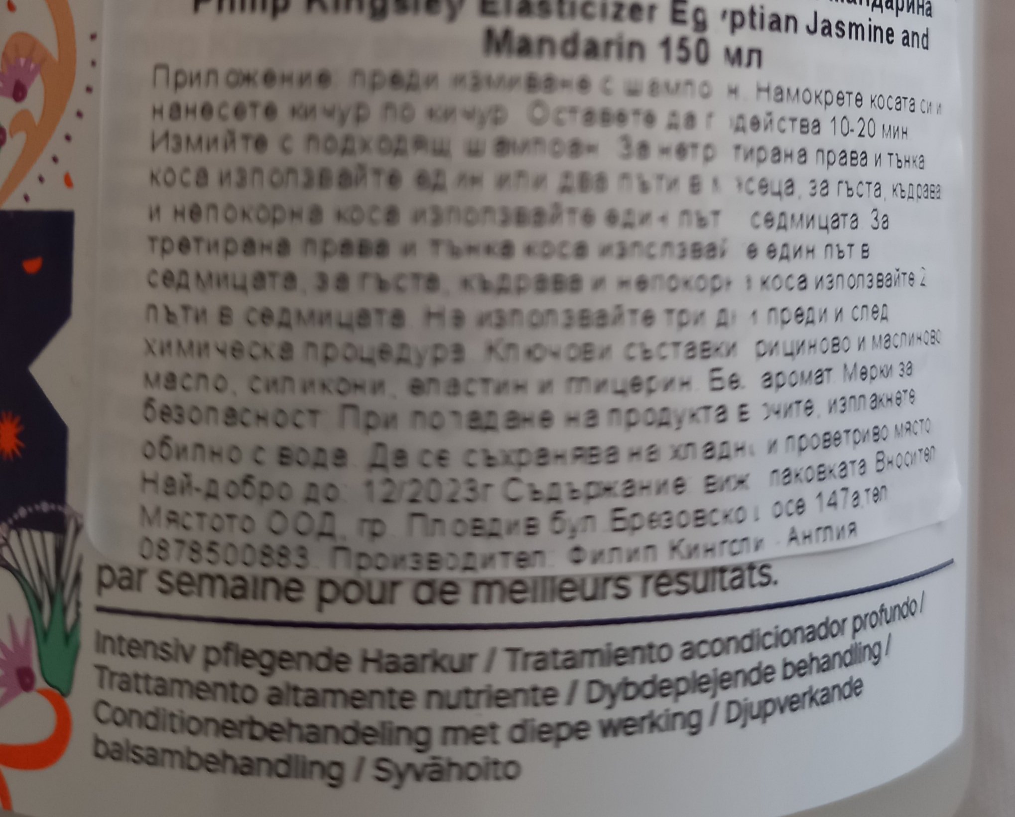 Аз съм с къносана коса, дълга малко над кръста. Домашния еластисайзер не ми понася, но този на Филип Кингсли ми харесва и го ползвам един-два пъти месечно. Или оставям на косата за цяла нощ или по 3-4 часа, само на опашката, като преди това навлажнявам и увивам в найлон. Както беше отбелязано и по-горе, несравнимо е удоволствието от този на Кингсли, нанася се лесно и ухае чудесно.
