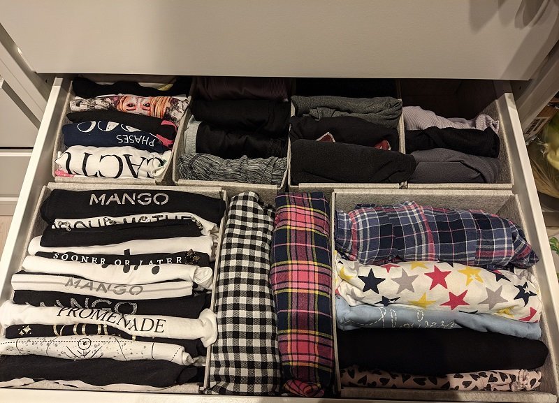 Аз също подреждам така тениските, но по няколко в един органайзер. Така не се разбутват, като изкараш 1-2.