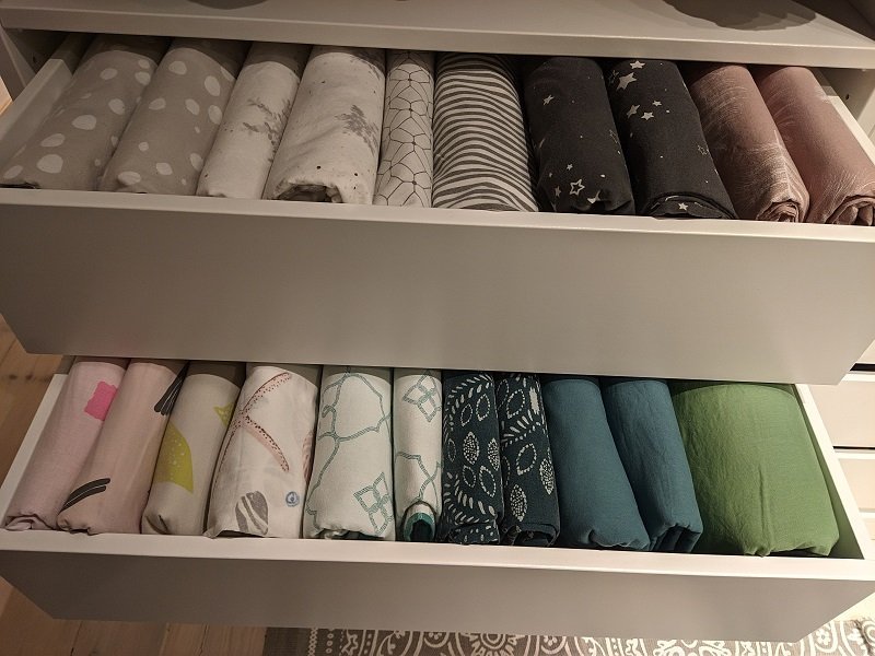 Вчера подредих вертикално спалните комплекти, не очаквах колко е удобно. А се е искало само да се прегънат на две. Моите чекмеджета са Pax с дълбочина  60 см. Автоматично се освободи едно чекмедже, намери се изгубен (в плик) самотен бял чорап ).